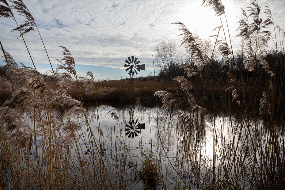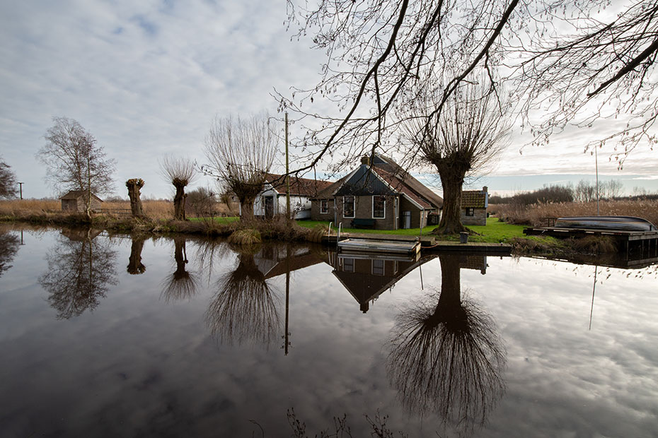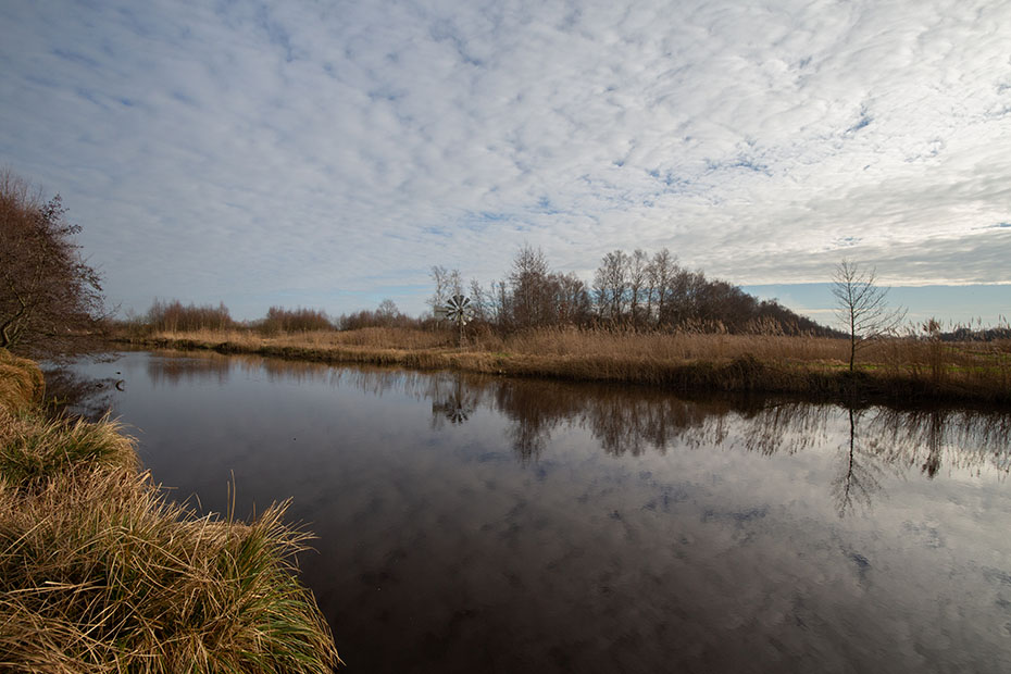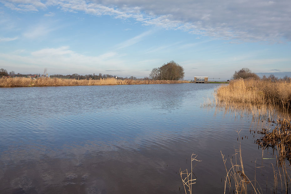 Vanaf een vlonder had ik ruim zicht over de Jonkers- of Helomavaart. Aan de horizon staat het Auke Algera gemaal. Dit gemaal is voor de afwatering van overtollig water vanuit de Scheene op de Jonkers- of Helomavaart. Zie Google Maps.
