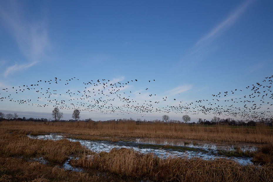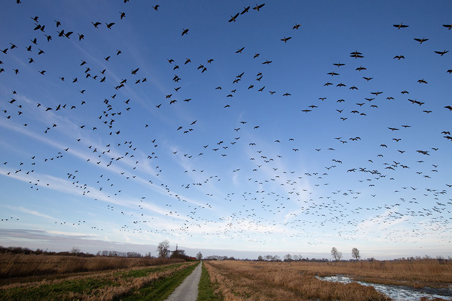 Ik was bijna bij het beginpunt van mijn wandeling toen ik het aanzwellende geluid van een grote groep opvliegende ganzen hoorde. Het volgende moment was de lucht boven mijn hoofd vol met ganzen. Een indrukwekkend moment.