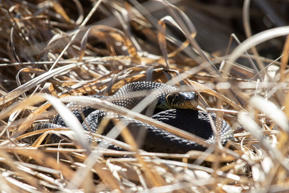Op die bewuste zonnige middag had ik het geluk om een ringslang te fotograferen. Deze lag te zonnen in het riet naast de vlonder.