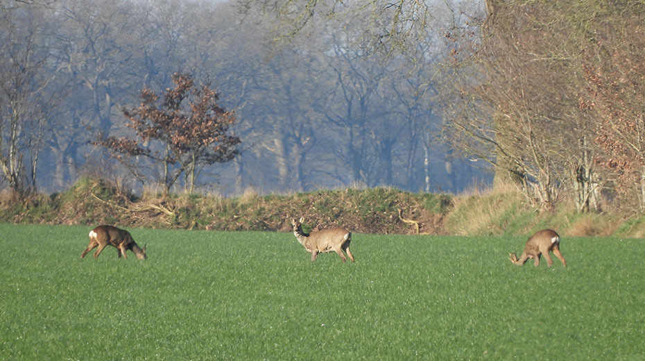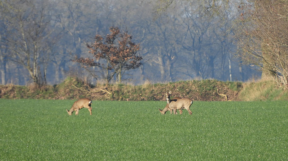In een weiland was mooi te zien tot hoever de zonnestralen waren gekomen. Heel in de verte zag ik een sprong reeën staan. Het was alweer een tijdje geleden dat ik reeën had gefotografeerd.