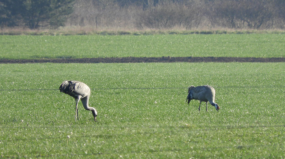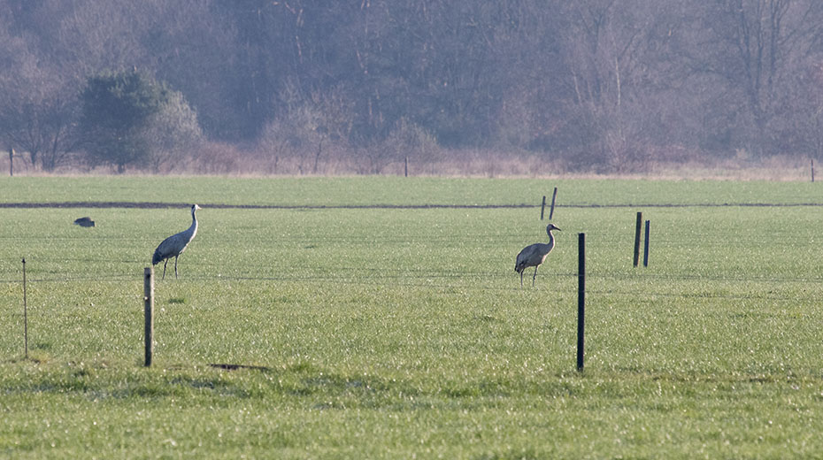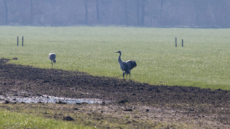 In een ander weiland stonden een aantal kraanvogels te foerageren. Ze stonden te ver weg voor mooie foto´s. Maar in dit geval gaat het om de waarneming en niet in de eerste plaats om kwalitatief mooie foto´s. Ik wist waar ik moest zoeken anders was ik er vast aan voorbij gereden. Om ze niet onnodig te verstoren ga ik deze keer de locatie niet verklappen.
