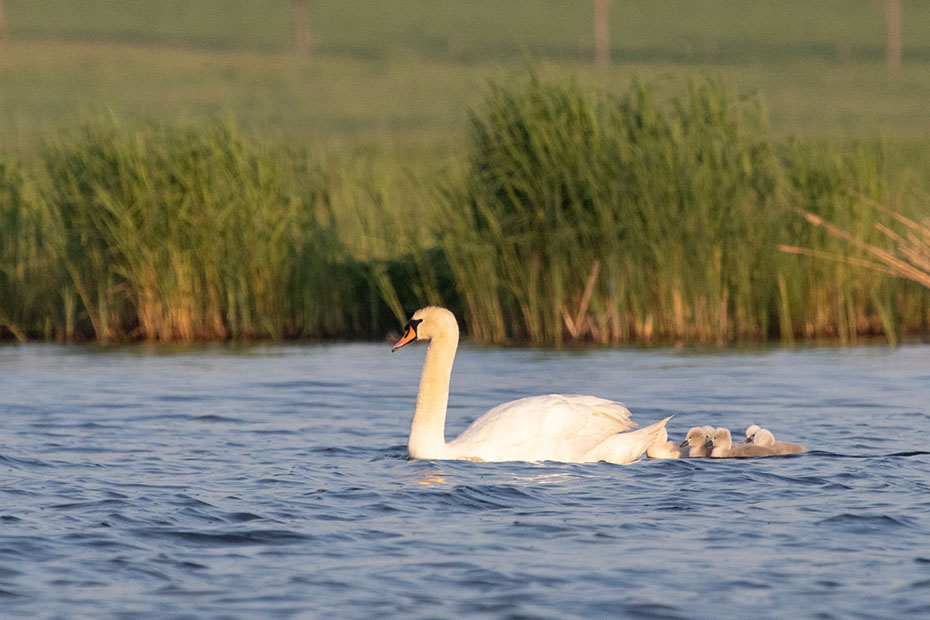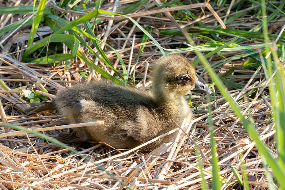 Een zwaan met jongen op de Beulakerwiede. Een gansje, achtergelaten op het nest. We kregen de indruk dat er iets met zijn pootje was.