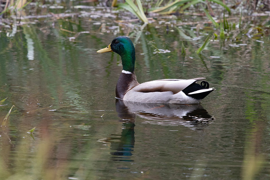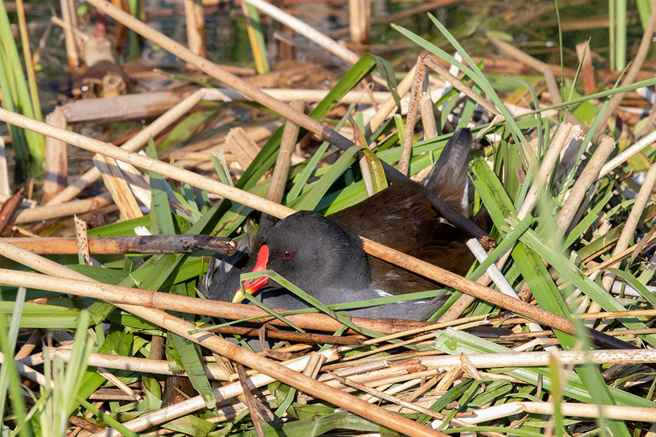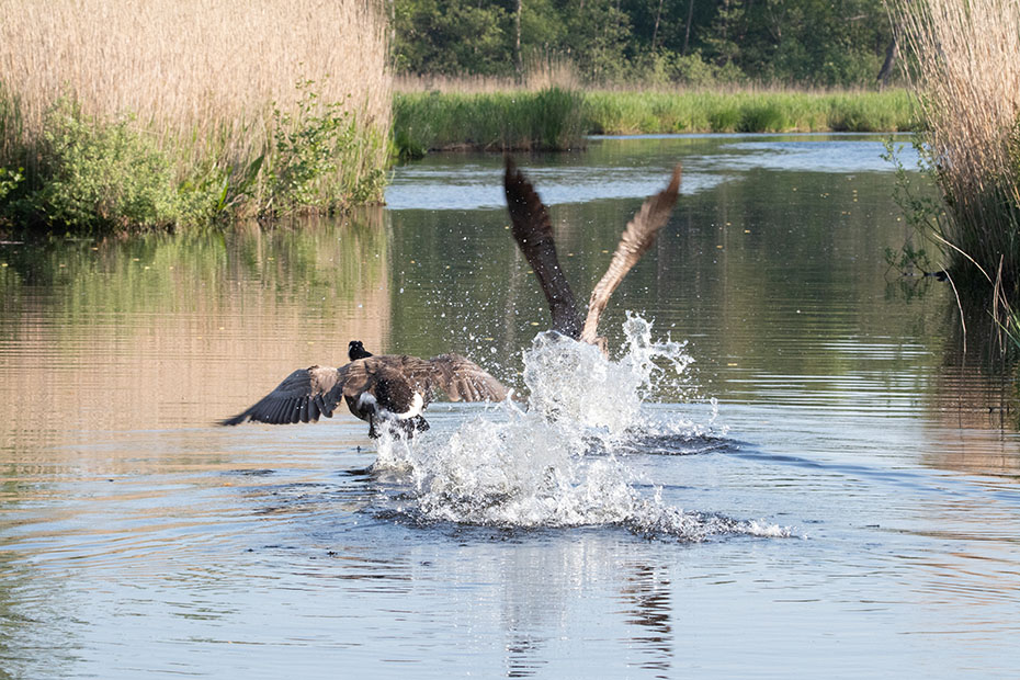 Vluchtende ganzen en een waterkipje aan het broeden.