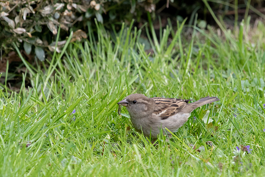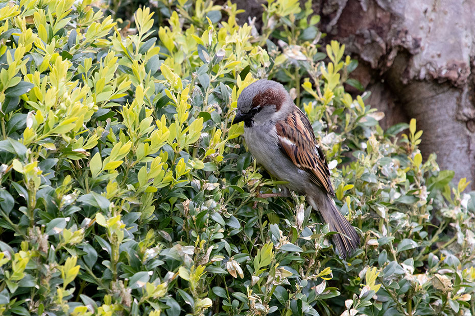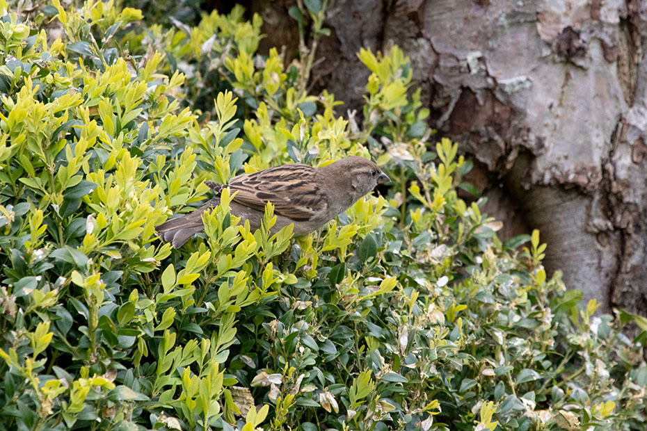 De belangrijkste reden dat we de haag hebben laten staan is omdat de mussen rupsen vangen en voeren aan hun jongen.