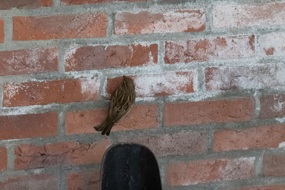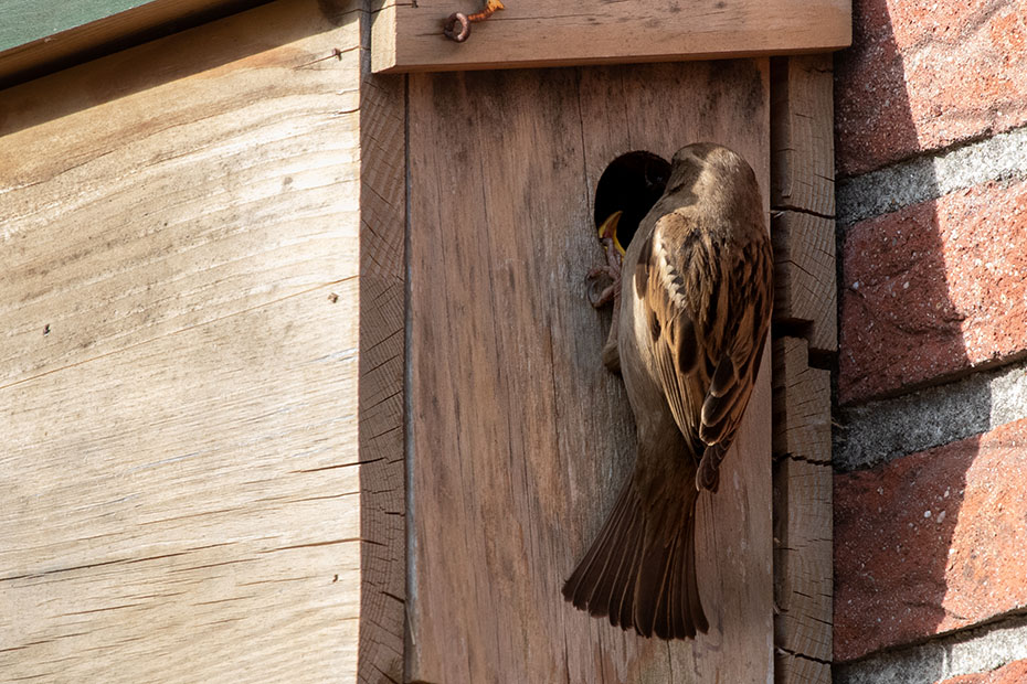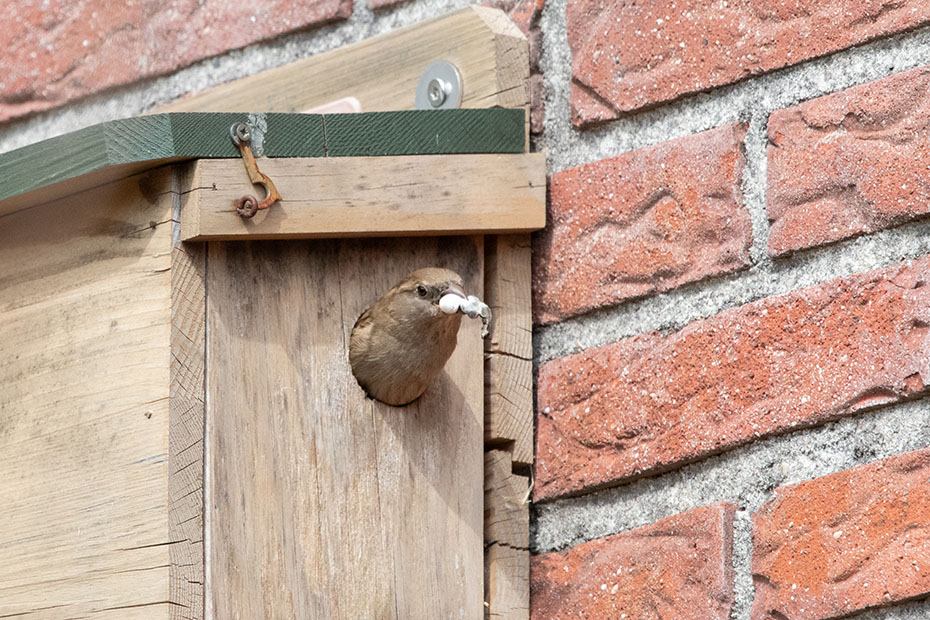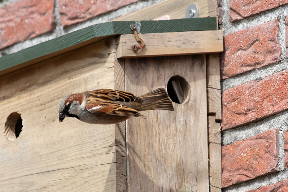 Het mussenhotel is ook dit jaar weer bezet. Deze keer hebben ze maar een van de drie kamers geboekt. De ouders vliegen af en aan om de jonge gasten te bedienen.