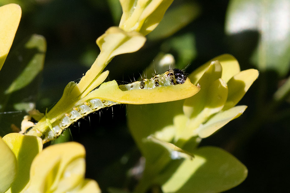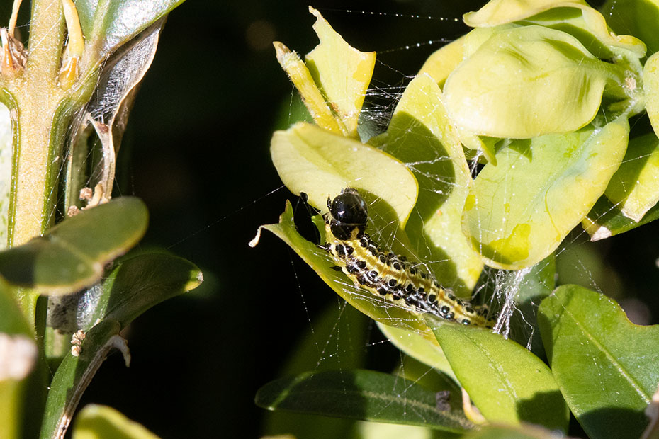 De andere buxushaag hebben we eerst nog laten staan. Die haag ziet er wat minder dramatisch uit en weghalen kan altijd nog. Een paar dagen geleden ben ik op zoek gegaan naar de rupsen van de buxusmot. Ze zaten lekker te smikkelen aan de jonge blaadjes.