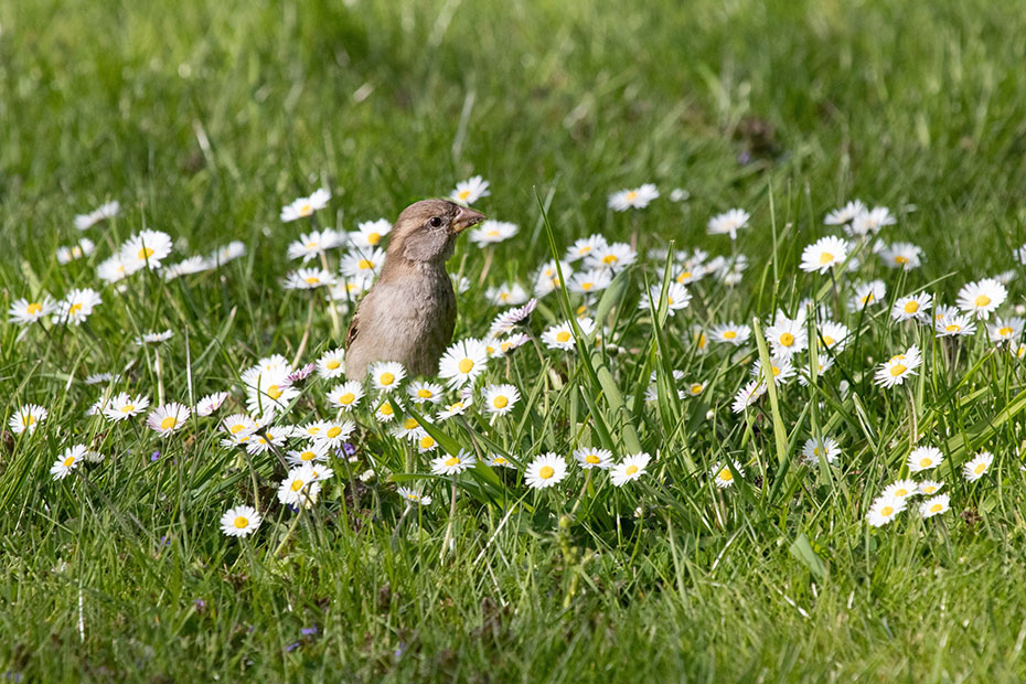 Ons gazon in de achtertuin is een bloemetjesgazon. We maaien in deze tijd zo min mogelijk om de bloemetjes te sparen. Rond de bloemen is ook altijd wat te vinden voor de voedende ouders. De mussen zitten ook regelmatig tegen de binnenmuur van de veranda geplakt. We hebben het idee dat ze behoefte hebben aan deze stof. Er zijn drie redenen dat een muur wit uitslaat. Het kan zout, salpeter of kalk zijn. De hypothese bij ons is dat het kalk is omdat de mussen het nemen. Maar wie het weet mag het zeggen.