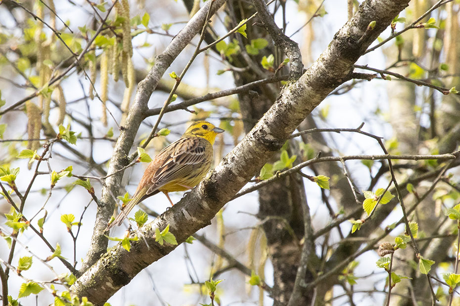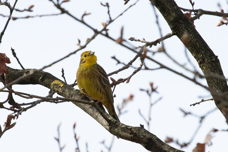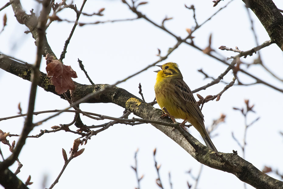 Even later vloog de geelgors naar een andere boom. Ook daar liet hij zijn mooie riedeltje horen.