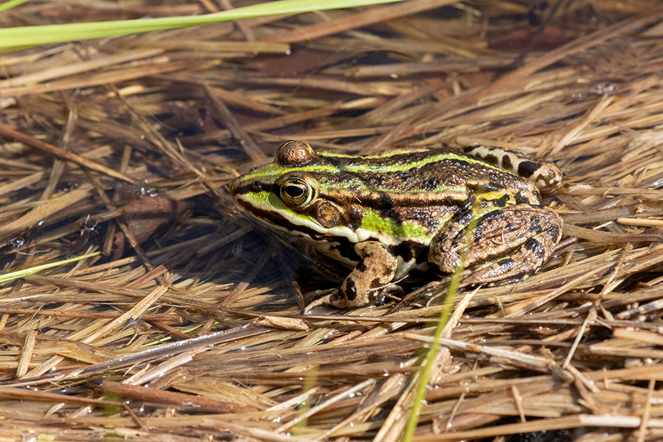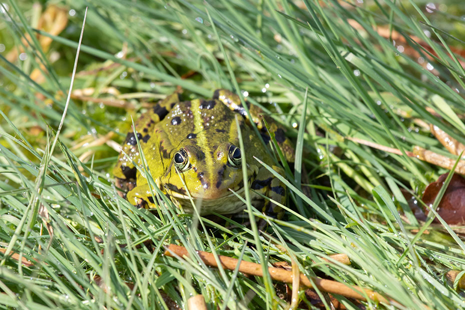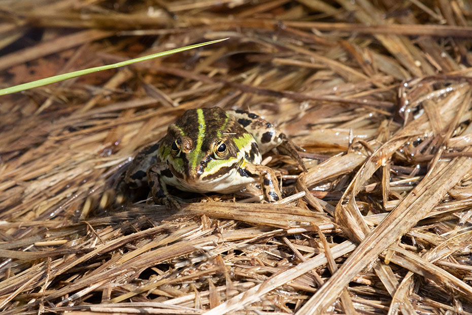 Er was geen ringslang te bekennen, niet bovenop de ruigte en ook niet in het water. Plotseling kwaakte er achter mij een kikker. Het gekwaak had hem verraden, want ik had de groene kikker nog niet ontdekt tussen het groen.