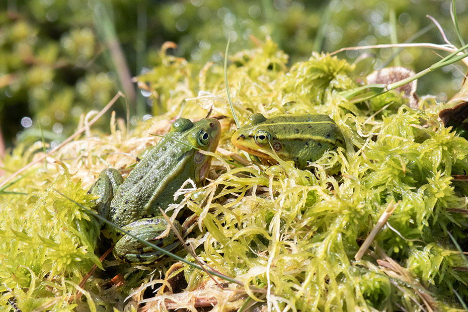 Op internet leerde ik dat de groene kikkers nogal lastig zijn te determineren. De grootste groene kikker is de meerkikker en de kleinste is de poelkikker. De meest voorkomende groene kikker is echter de bastaardkikker ook wel de middelste groene kikker genoemd. De bastaardkikker is een kruising tussen een meerkikker en een poelkikker. Ik denk dat de kleinste kikker op de linker foto een poelkikker is.