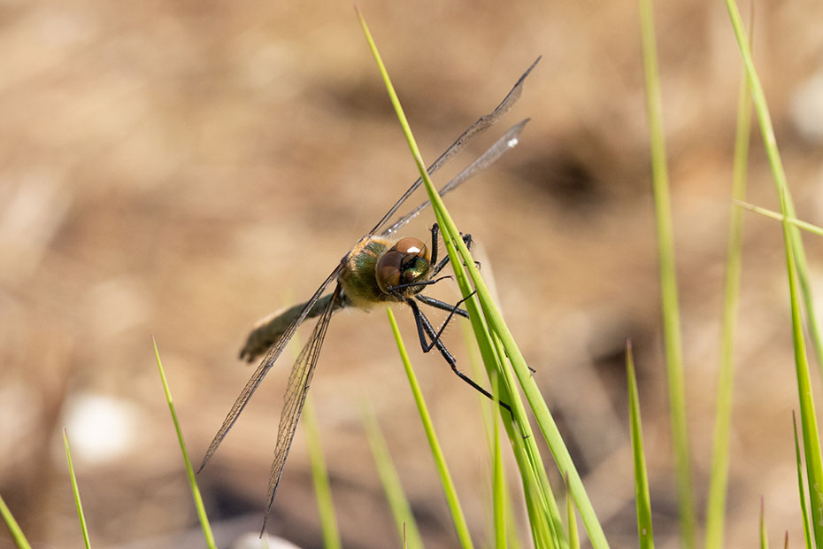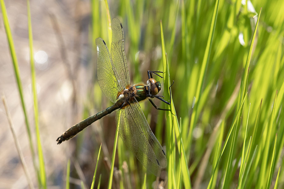 Naast de vlonder hing een smaragdlibel aan een grasspriet. De libel bleef rustig zitten. Wellicht dat deze libel eerder op de ochtend was uitgeslopen en dat hij nog aan het drogen was.