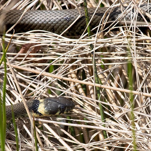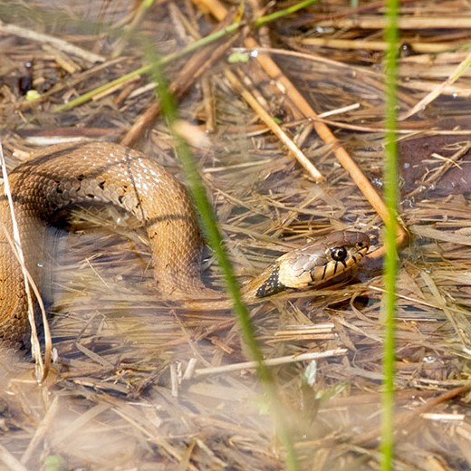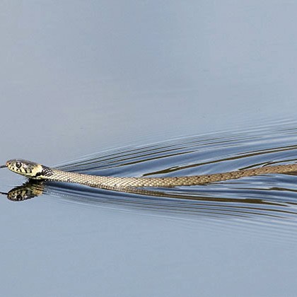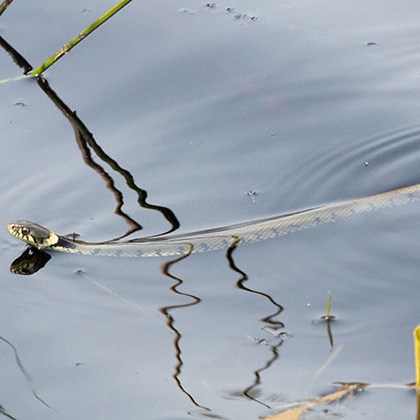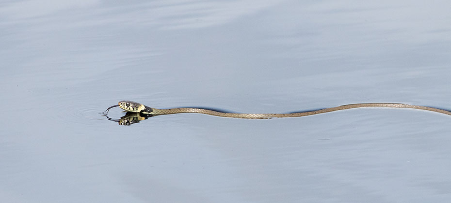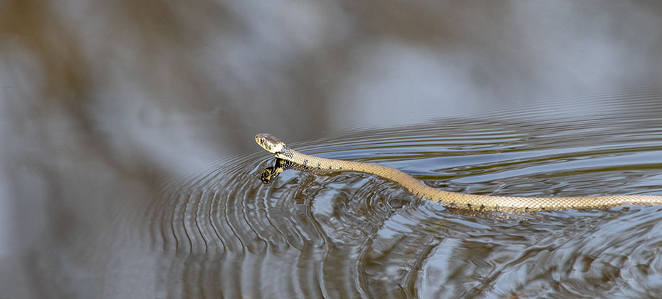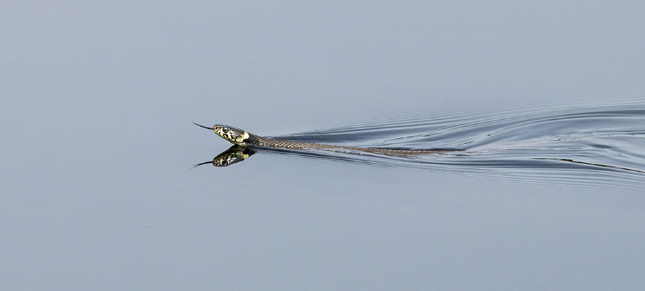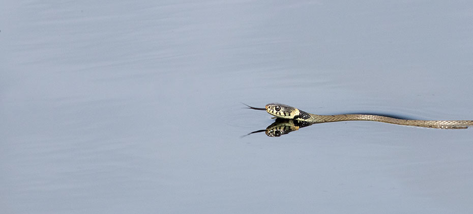 Wederom gleed er een slang door het water. De ringslang gebruikt de staart om te roeien. De ringslang dankt zijn naam aan de twee geelwitte vlekken achter zijn kop. Doordat die vlekken elkaar raken lijkt het een halsband of ring.