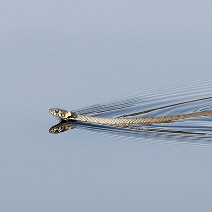 Ons wachten werd beloond, daar kwam uit het niets een ringslang voor ons langs zwemmen. Mooi zoals het spiegelgladde wateroppervlakte werd doorbroken door een lichte rimpeling.