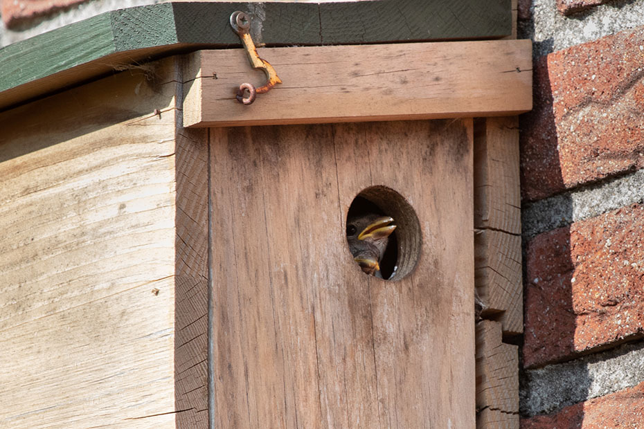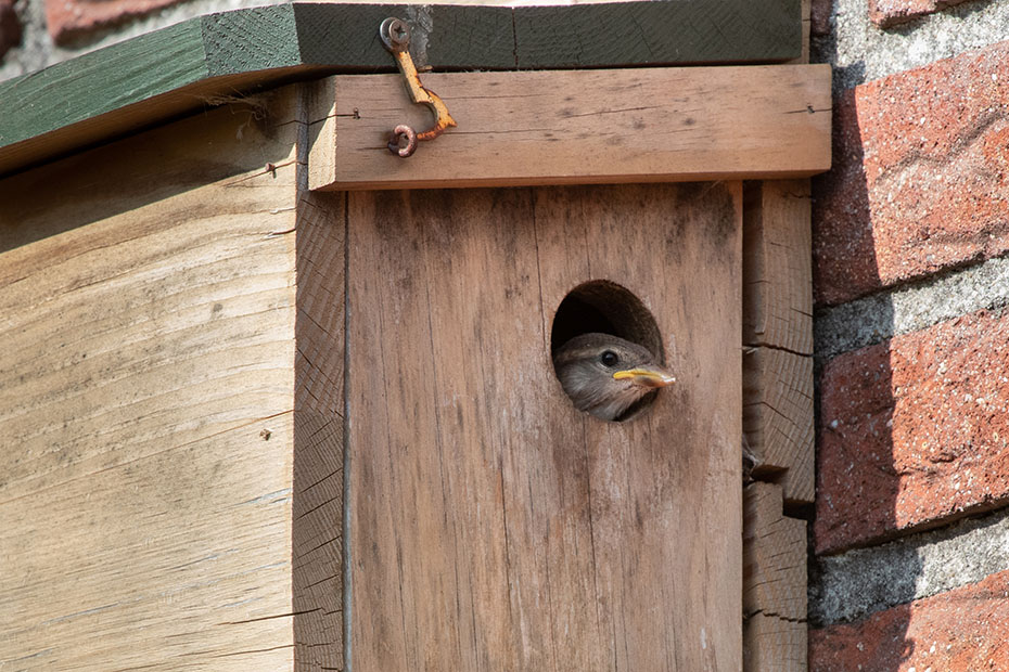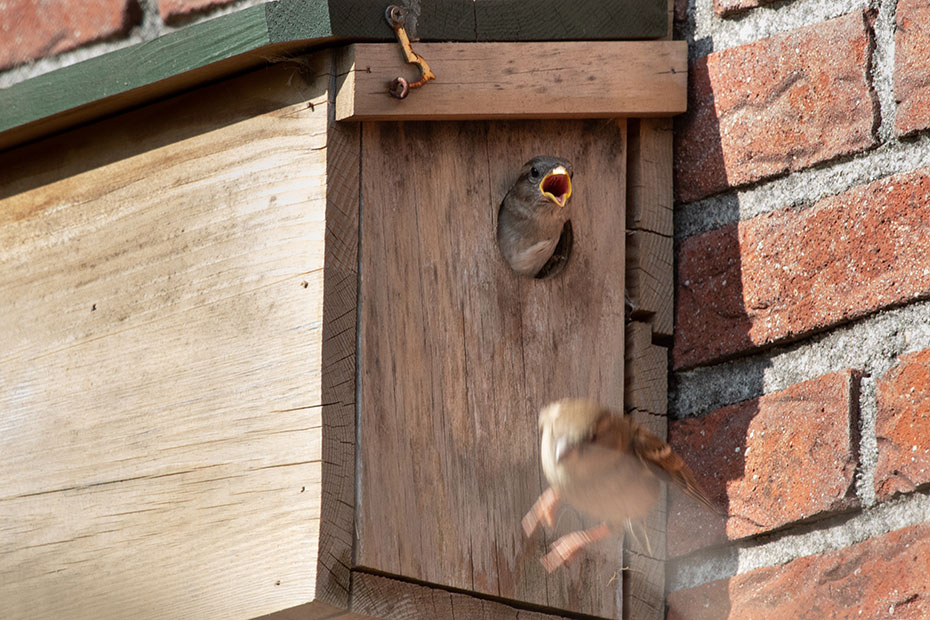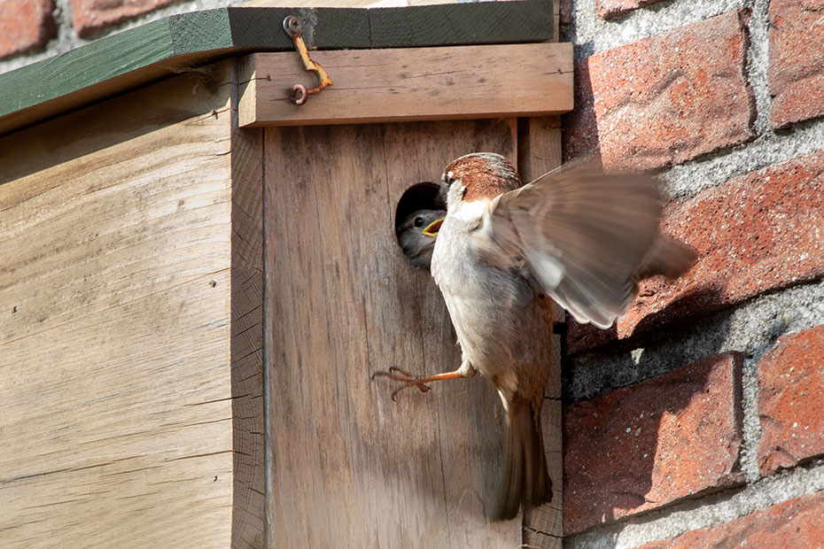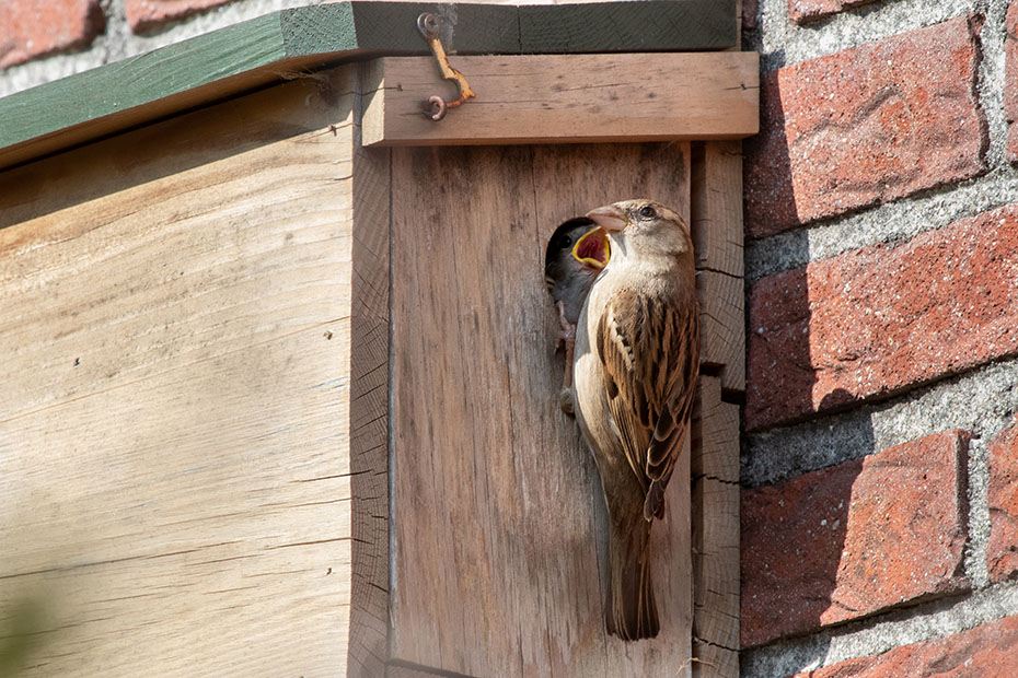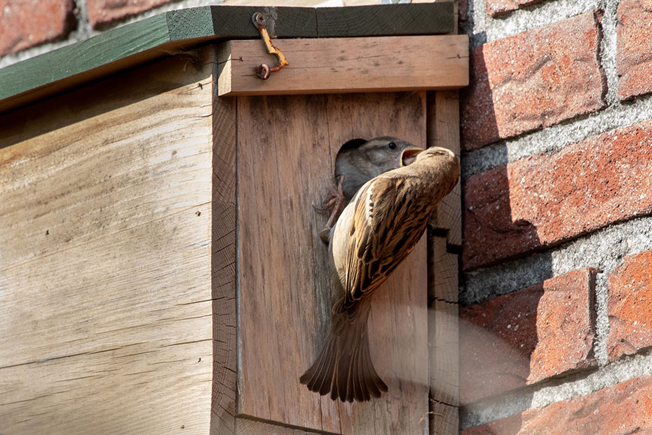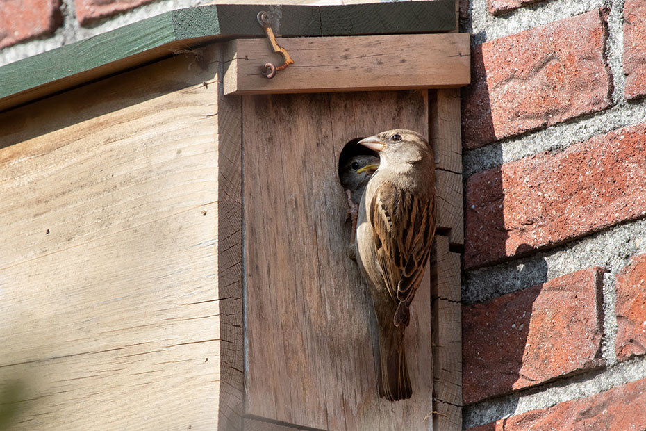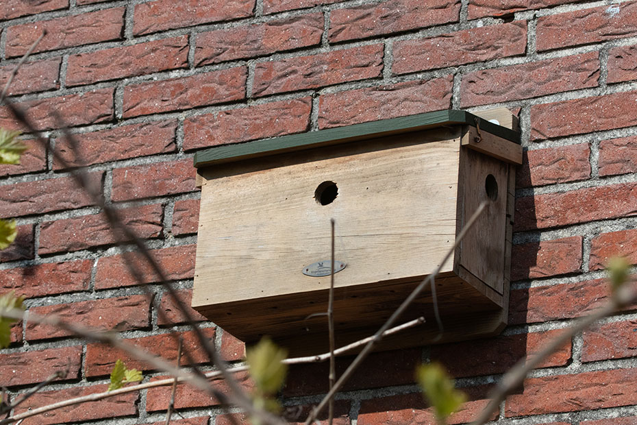 Op mijn weblog had ik al eerder aandacht besteed aan het mussenhotel in onze achtertuin. Alleen de kamer aan de rechterkant was bezet. Dat komt wellicht omdat die opening in de luwte zit.