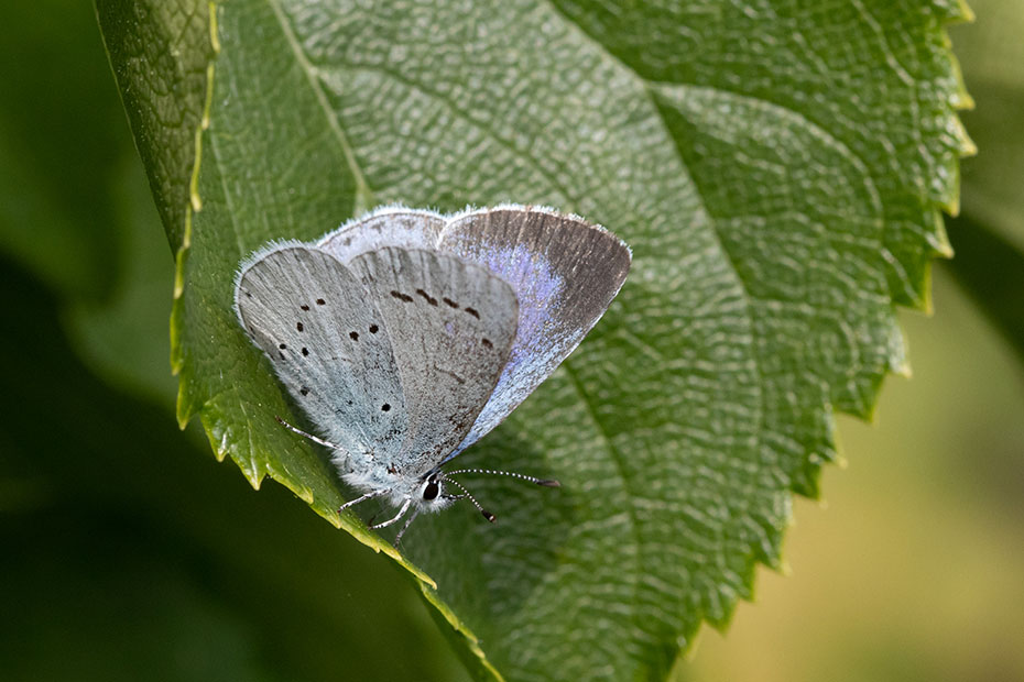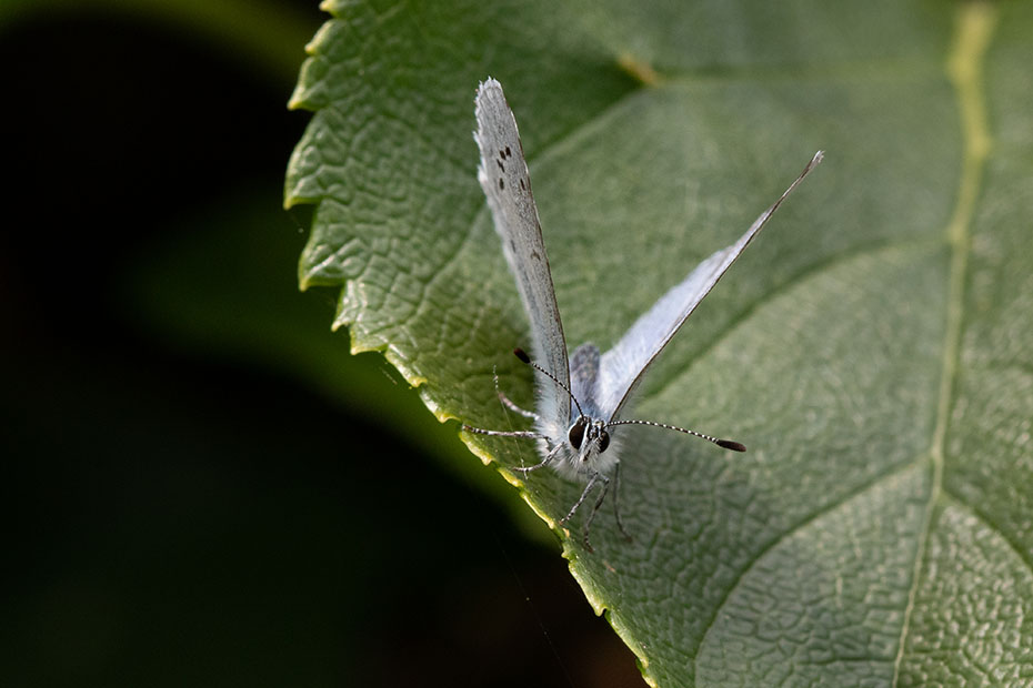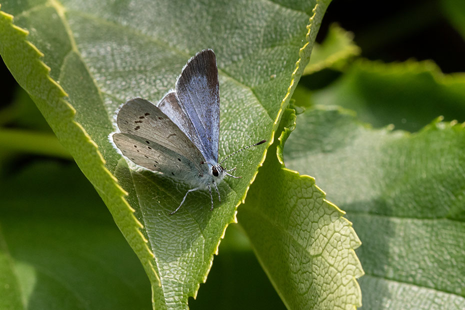 Ik haalde snel de camera met macro-objectief van binnen. Het blauwtje fladderde gelukkig nog in de buurt en streek weer neer op een blad van de klimhortensia.