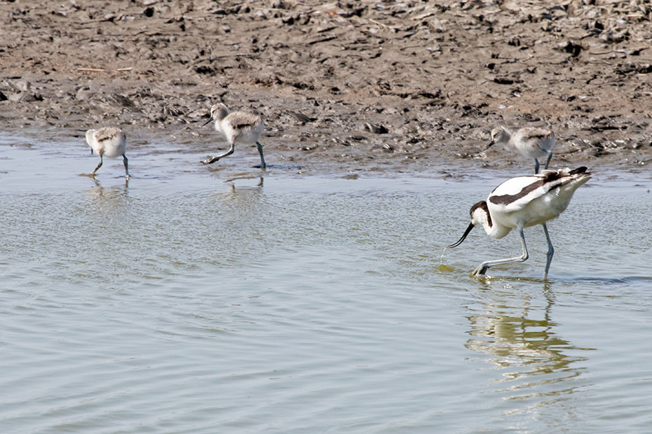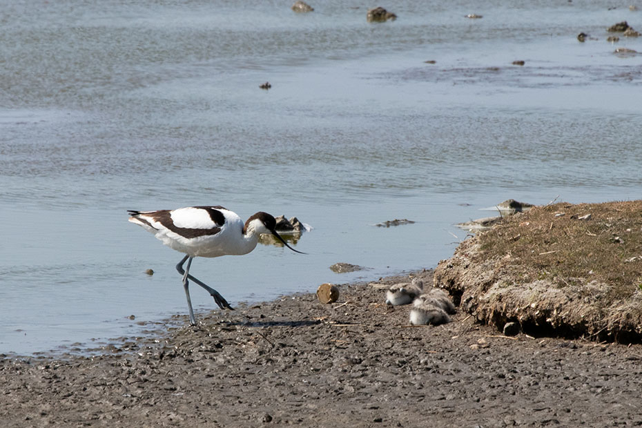 Daar kreeg ik een kluut met jongen in het vizier. Grappig om te zien hoe zelfstandig de jongen al zijn met het zoeken naar eten. Daarbij mogen ze best een eindje van de ouder weglopen. Als het penibel wordt staat de ouder weer klaar. Het lijkt me het perfecte opvoedingsplaatje…