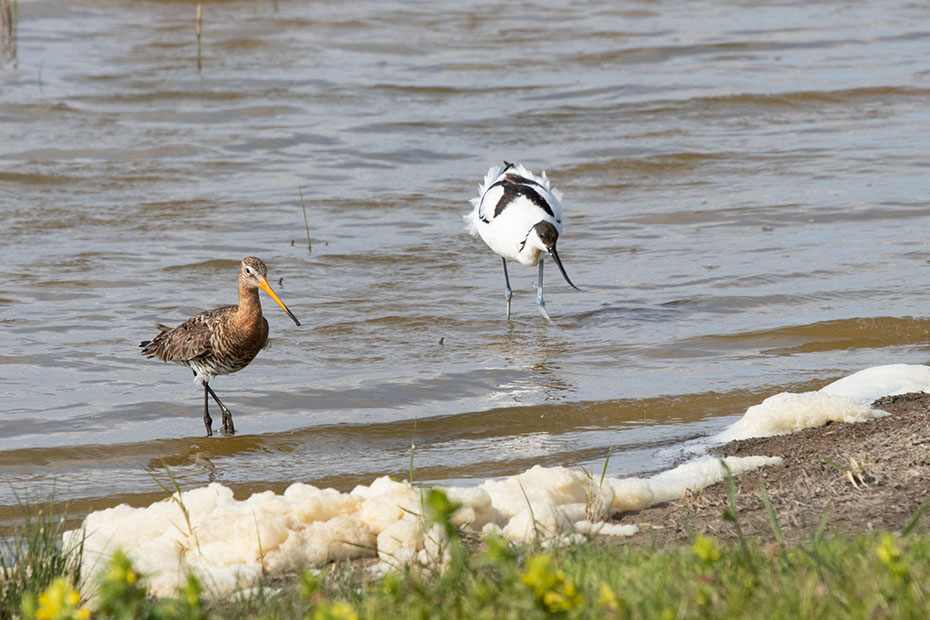 De grutto stapte naar het water en ging daar foerageren. Even later kwamen er een paar kluten in de buurt. Beide partijen dulden elkaar.
