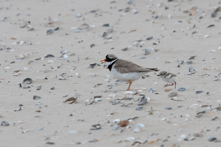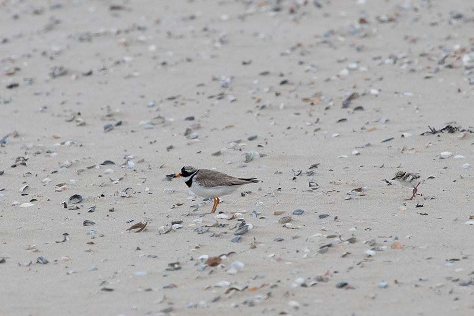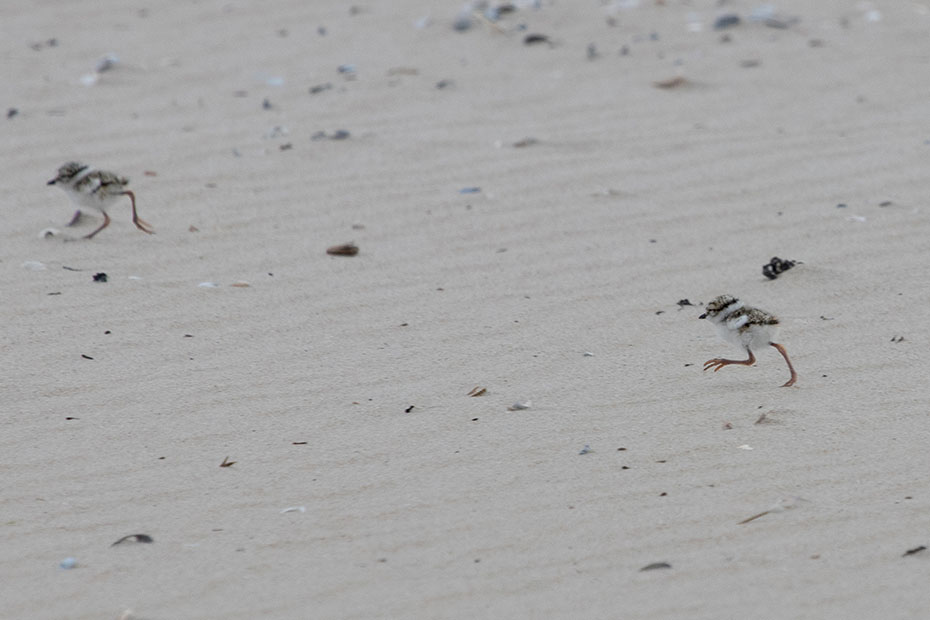 Bij het inzoomen zag ik al snel dat er behalve een ouder ook twee jongen liepen. De jongen waren nauwelijks te onderscheiden tussen de schelpen. We vroegen ons wel af of het wel goed zou komen met deze kleintjes met al die loslopende honden…