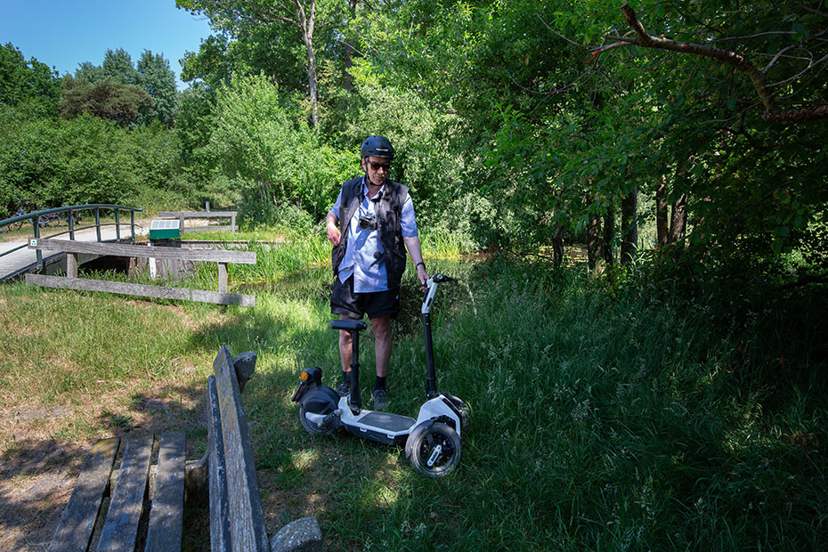 Een paar weken geleden was het dan zover, de primeur. Jan ging op de iLark en ik op de e-bike. We startten vanaf het huis van Jan en Aafje. Jan had een route uitgestippeld. De eerste stop was bij een bruggetje net buiten Drachten. Op de achtergrond raasde het verkeer over de A7.