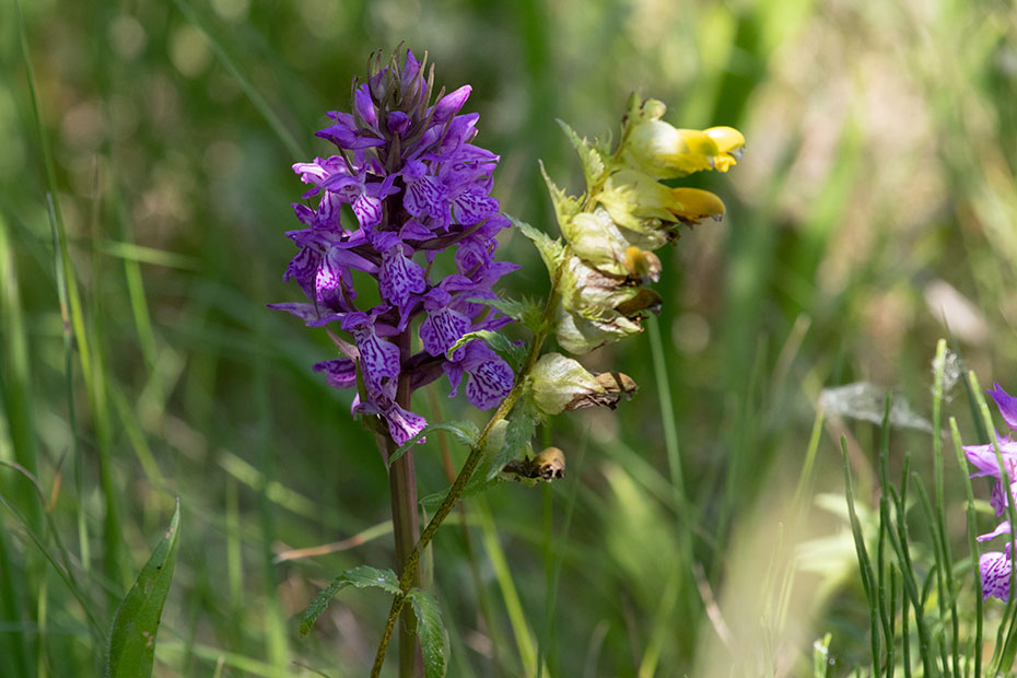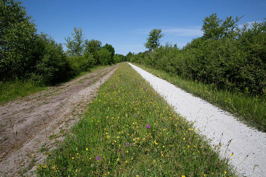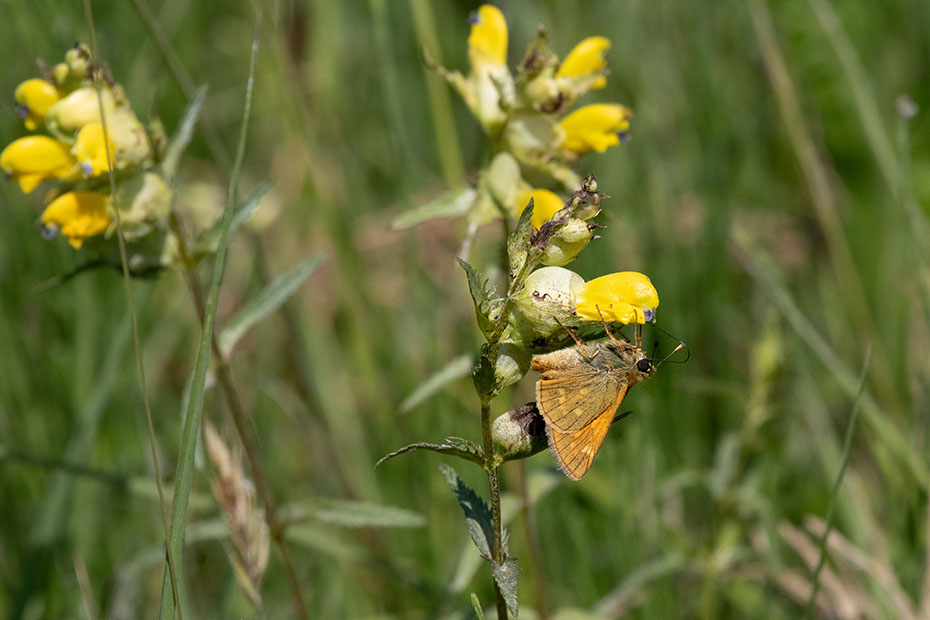 De middenberm nabij het vennetje stond vol met brede orchissen en kleine ratelaar. Op een ratelaar foerageerde een groot dikkopje.