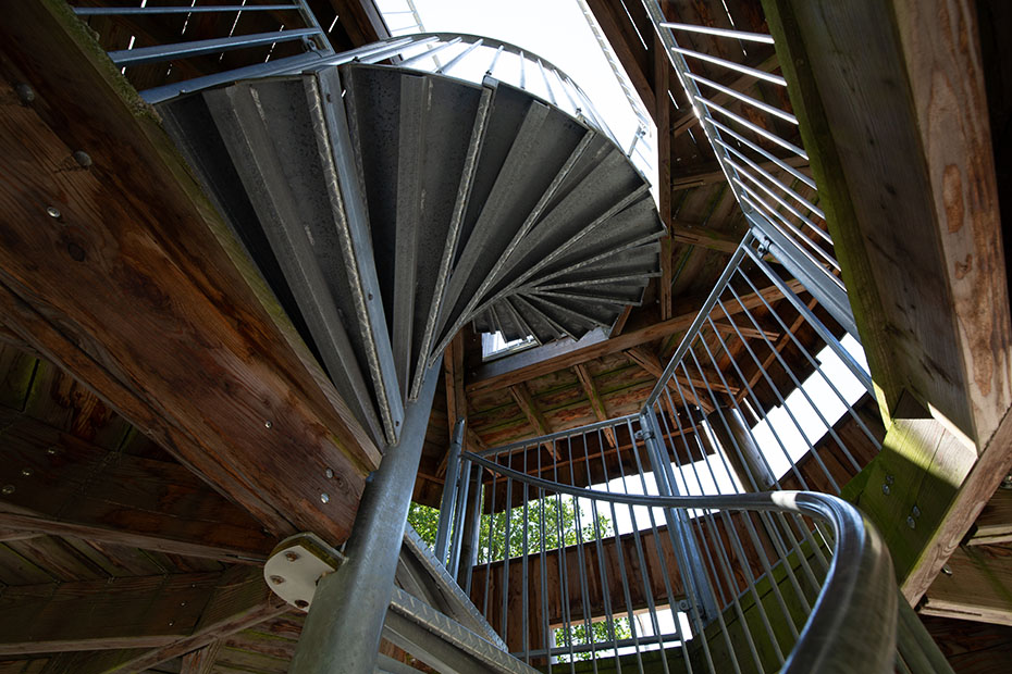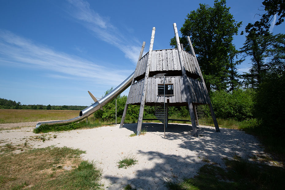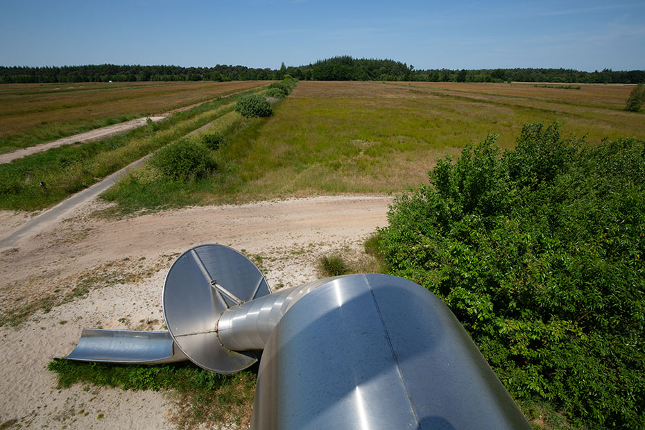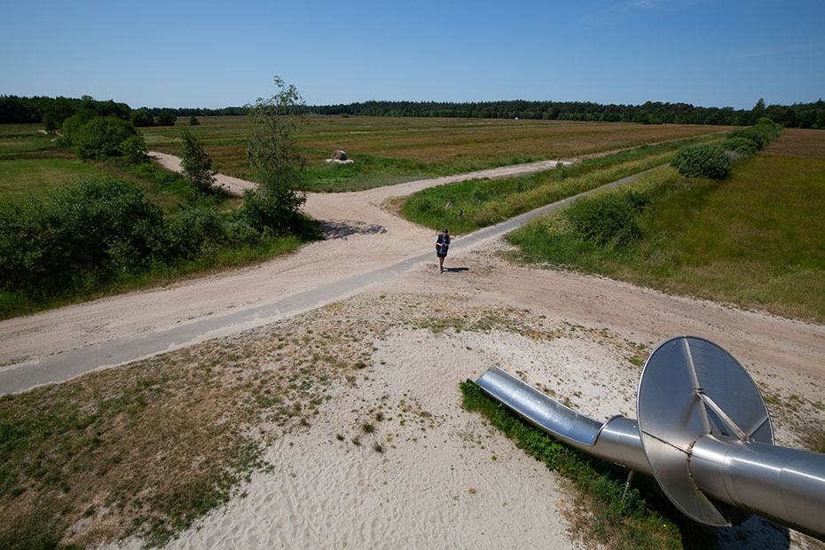 De volgende verrassing was uitkijktoren de Skarrekieker. Deze staat in natuurgebied Hemrikkerscharren. Zie Google Maps. Deze uitkijktoren is ontworpen door kinderen en dat is te zien. Er is een glijbaan, een klimnet en een glijpaal. Ik heb nog even overwogen om via de glijbaan weer naar beneden te gaan, maar het was me toch te steil. Dat leek met behangen met camera’s toch niet zo’n goed idee.