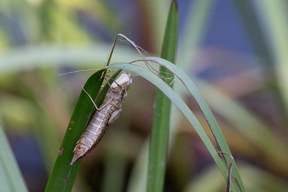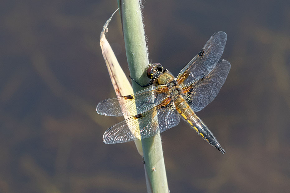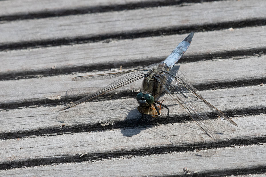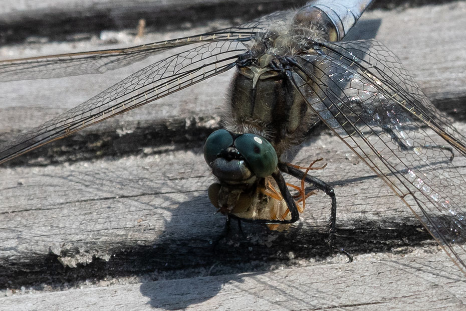 Al wandelend over de vlonder zag ik veel libellen en juffers. Er hing zelfs nog een jasje van een uitgeslopen libelle. Op de vlonder zat een gewone oeverlibel. Op de computer zag ik dat de libel iets had omklemd. Het was een kop en poten van een libel. Op internet zocht ik naar kannibalisme bij libellen. Dat fenomeen bestaat. Pas uitgeslopen libellen bijvoorbeeld vallen wel eens ten prooi aan adulte soortgenoten. Een uitgebreid artikel over kannibalisme bij libellen kun je hier vinden. Op YouTube vond ik dit filmpje waarop is te zien dat een libel zich tegoed doet aan een andere libel.