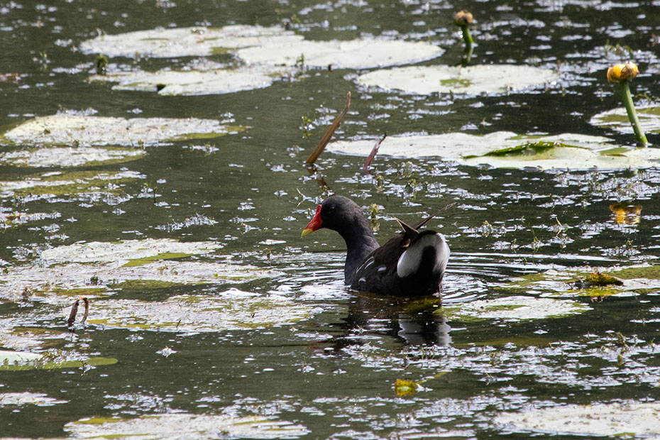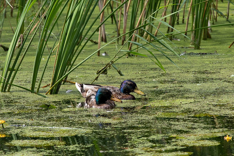 Vanaf dit pad had ik mooie doorkijkjes. Een paar eenden dobberden tussen het eendenkroos. Een eind verderop zwom een waterhoentje. Ook zag ik een ijsvogel wegschieten, maar die was te ver weg om op de foto te zetten.