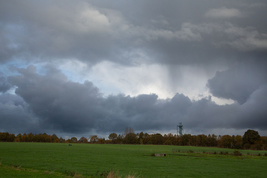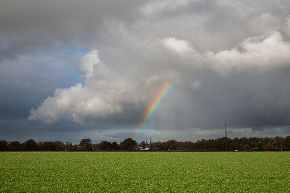 Na de wandeling op de Woldberg ben ik doorgereden naar een volgend bos. Onderweg zag ik een dreigende lucht en een kleine maar felgekleurde regenboog.
