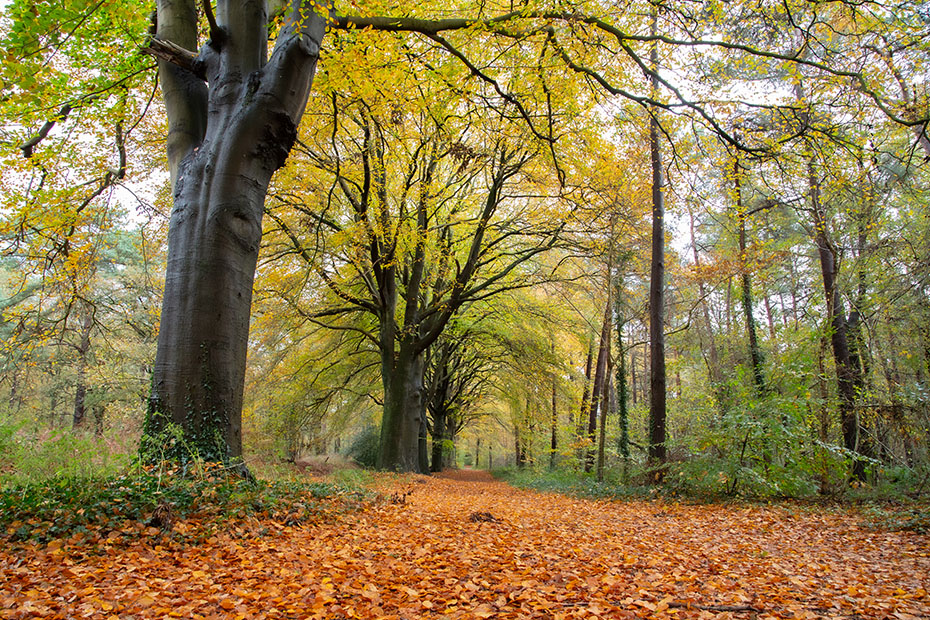 Toen ik een eindje verder wandelde kwam ik langs enorme bomen in herfsttooi. Het gekleurde tapijt maakte het herfstplaatje compleet.