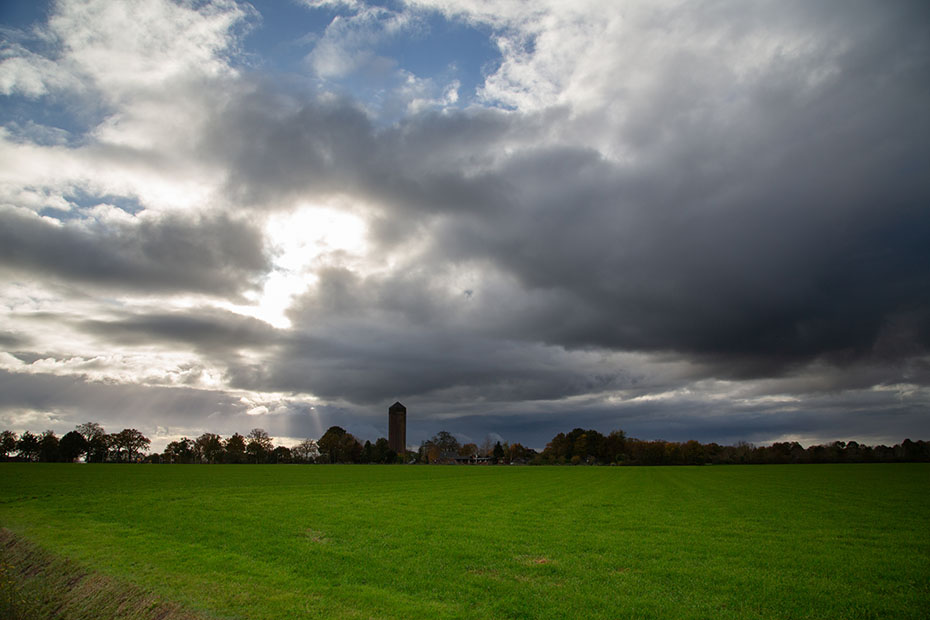 Na de fotosessie op de Woldberg ben ik doorgereden naar een ander bos. De dreigende lucht boven de watertoren nabij Tuk beloofde niet veel goeds. Gelukkig moest ik de andere kant op, dus misschien zou ik de dans ontspringen…