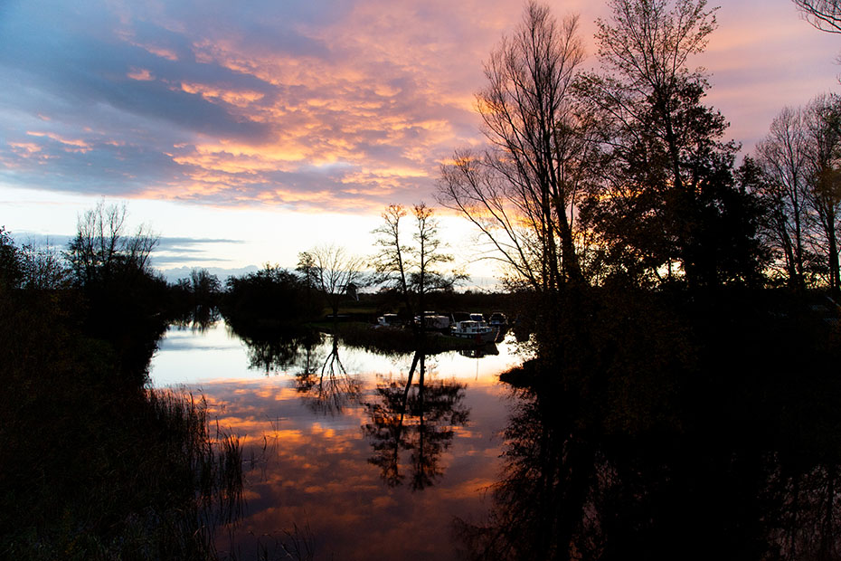 Na de wandeling door het Sterrenbos reed ik terug naar huis. Onderweg zag ik de lucht prachtig kleuren. Ik reed daarom ons huis voorbij en parkeerde de auto op de brug over de Linde. De zon was net onder, toch kon ik nog een mooie lucht met weerspiegeling meepakken.