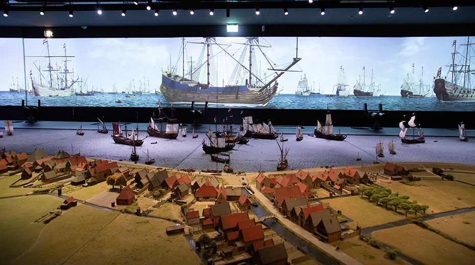 We starten onze rondgang bij de tentoonstelling ‘Schip in Zicht- De Reede van Texel en de Wereld’. Met behulp van bewegende beelden komt de Reede van Texel tot leven. Aan ’s werelds grootste maritieme maquette is een dimensie toegevoegd. De verborgen verhalen over de 160 schepen worden dankzij nieuwe technieken zichtbaar. Ze laten zien dat de Reede van Texel hèt logistieke knooppunt van de zeventiende eeuw was. Bron is deze pagina.