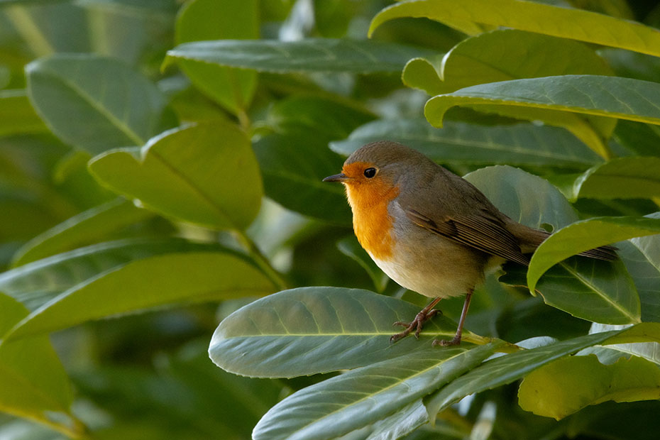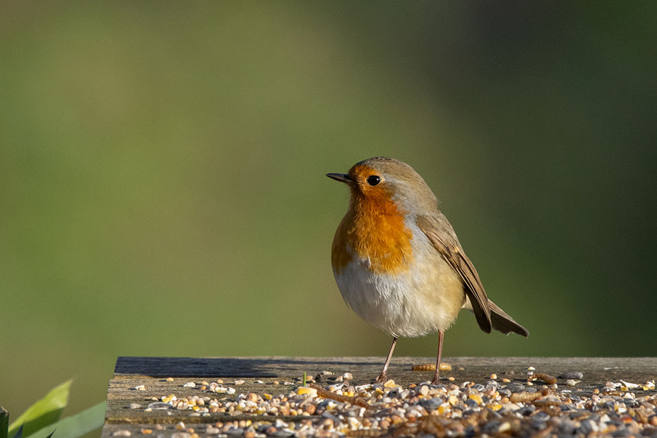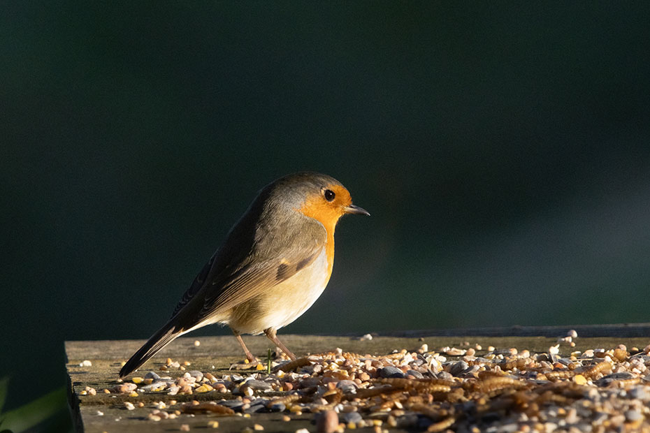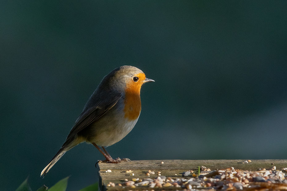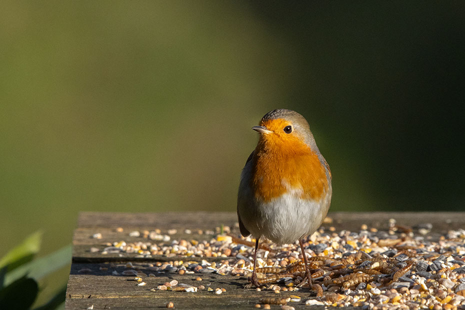Deze roodborst bleef langere tijd op de voedertafel staan. Niet omdat hij niet kon kiezen, niet omdat hij graag op de foto wilde, nee het had een andere reden.