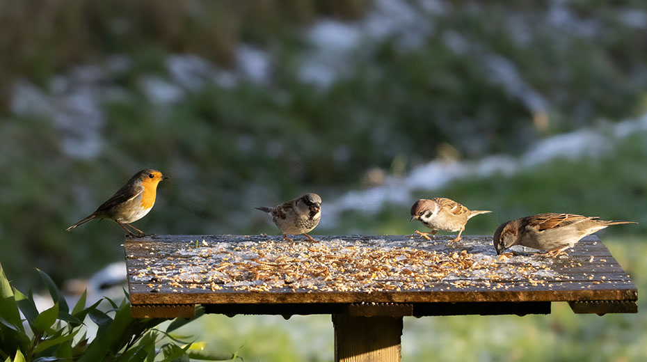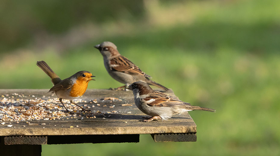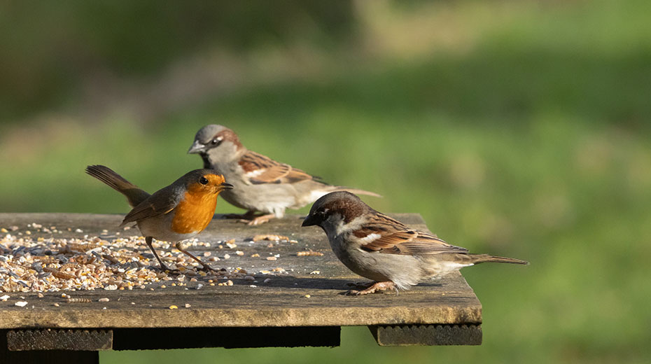 De mussen keken de roodborst aan, maar ze gingen niet opzij. De roodborst deed nog een stap naar voren, maar ook dat maakte geen indruk.