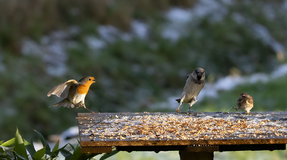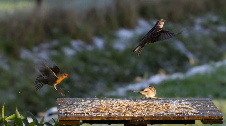 In deze serie liet ik zien hoe een roodborst zich heer en meester voelde over de voedertafel en een koolmees wegjoeg. Even later probeerde de roodborst dat ook bij de huismussen. Vol vuur stoof de roodborst op de mussen af.