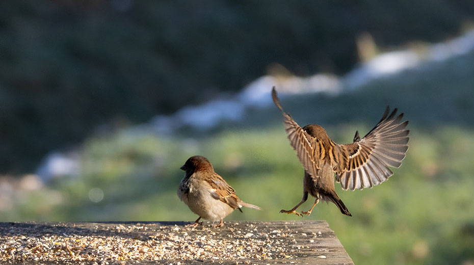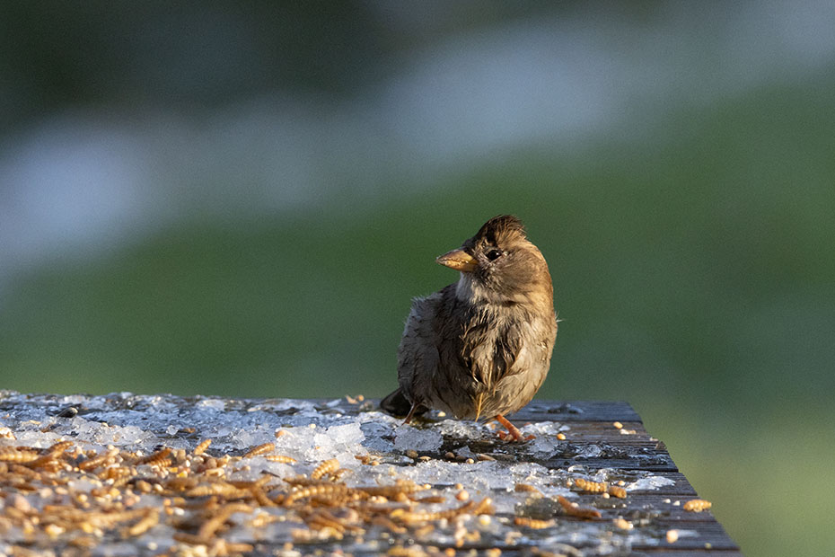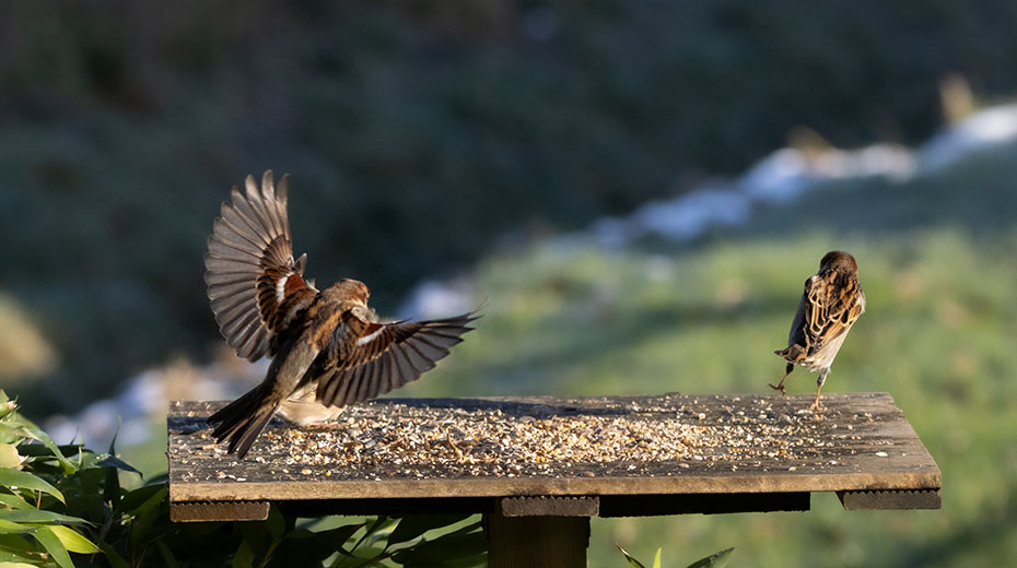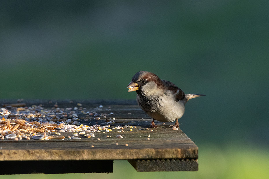 Op een dag heb ik de spiegelreflex met de 150-600 zoom op het statief gezet. Mijn doel was om het komen en het gaan van de mussen te fotograferen. Met 200 mm zoomde ik niet al te ver in. Met de ISO op 2500 en een diafragma van 6.44 kwam ik uit op een sluitertijd van pakweg 1/3165 seconde. Oh ja, de drive stond op high speed.
