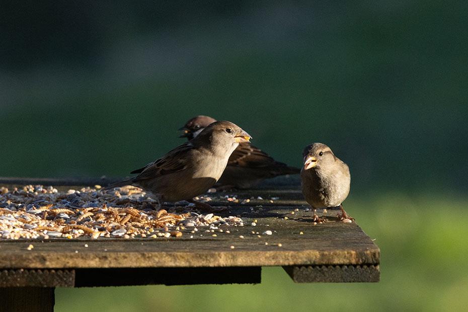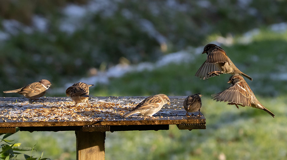 De huismussen zijn het best vertegenwoordigd op de voedertafel. Na uitgebreide observatie kan ik wel stellen dat ze tolerant zijn naar andere vogels.