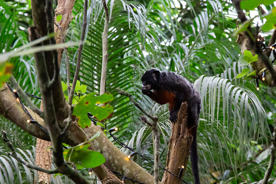 Vandaag neem ik jullie weer mee naar de Orchideeën Hoeve. We wandelen het Amazone Regenwoud binnen. In een boom zat een aapje. Je moet wel echt goed zoeken om de aapjes te vinden. Dit is een Roodbuiktamarin.