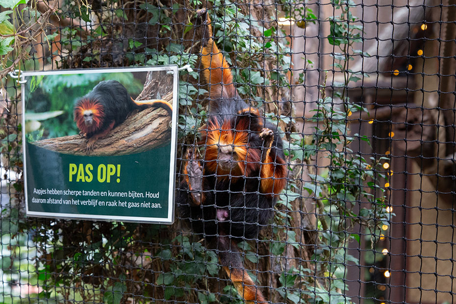 De goudkopleeuwaap zit achter een net. Kennelijk is dit soort wat minder vriendelijk. Op deze site kun je meer lezen over deze drie soorten aapjes.