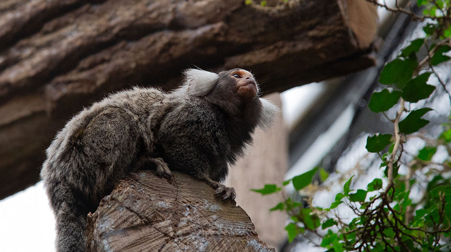 Op een boomstam hoog boven mijn hoofd zat een Witoorpenseelaapje.