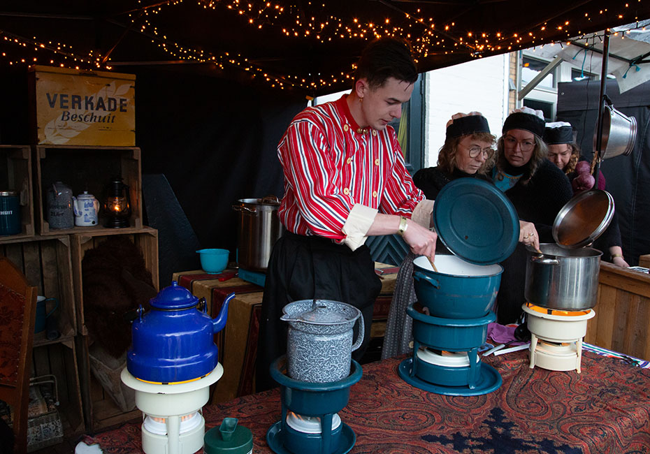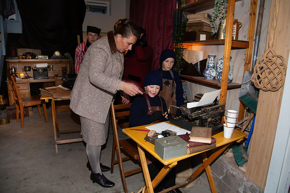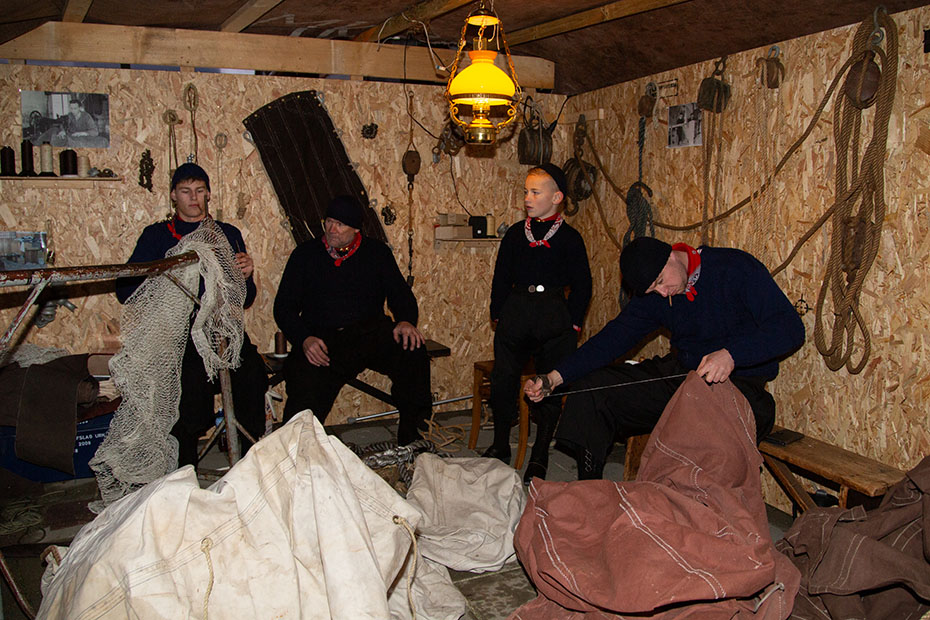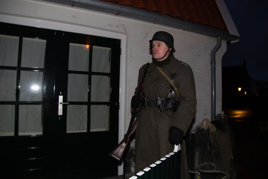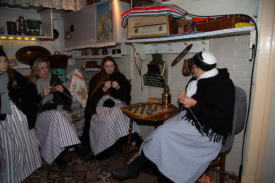 In de besloten gemeenschap kwam men graag bij elkaar. Men at gezamenlijk. Men was met elkaar aan het handwerken. Er werden netten geboet. Er werd heimelijk geluisterd naar Radio Oranje. Een Duitse soldaat komt polshoogte nemen, als dat maar goed gaat.