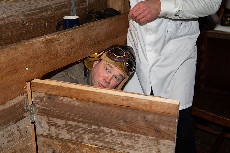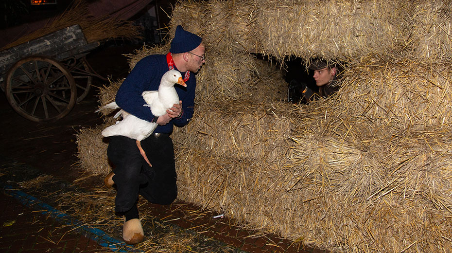 Buiten het dorp was een vliegtuig neergestort. De gewonde piloot werd van het ene naar het andere onderduikadres gebracht. Een van de schuilplaatsen was onder de bedstee. Ook zat er een onderduiker achter de pakjes hooi op de hooizolder. In de straten drommen angstige kinderen samen terwijl de Duitsers bezig zijn met een razzia.