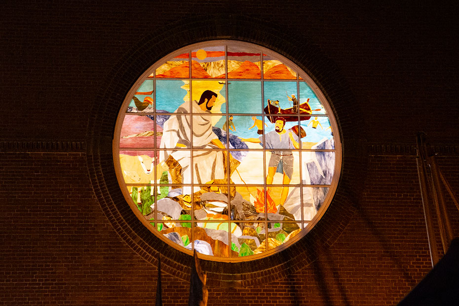 Aan het einde van onze rondwandeling door Urk kwamen we wederom langs de Bethelkerk. In de buitengevel zit een glas-in-lood raam wat in het donker goed opvalt. Dit raam, wat geplaatst is in 2005, is gemaakt door Geert Weerstand uit Urk. Het stelt Jezus voor, die na Zijn opstanding bij het meer zit, terwijl Petrus naar hem toeloopt. Zie deze site
