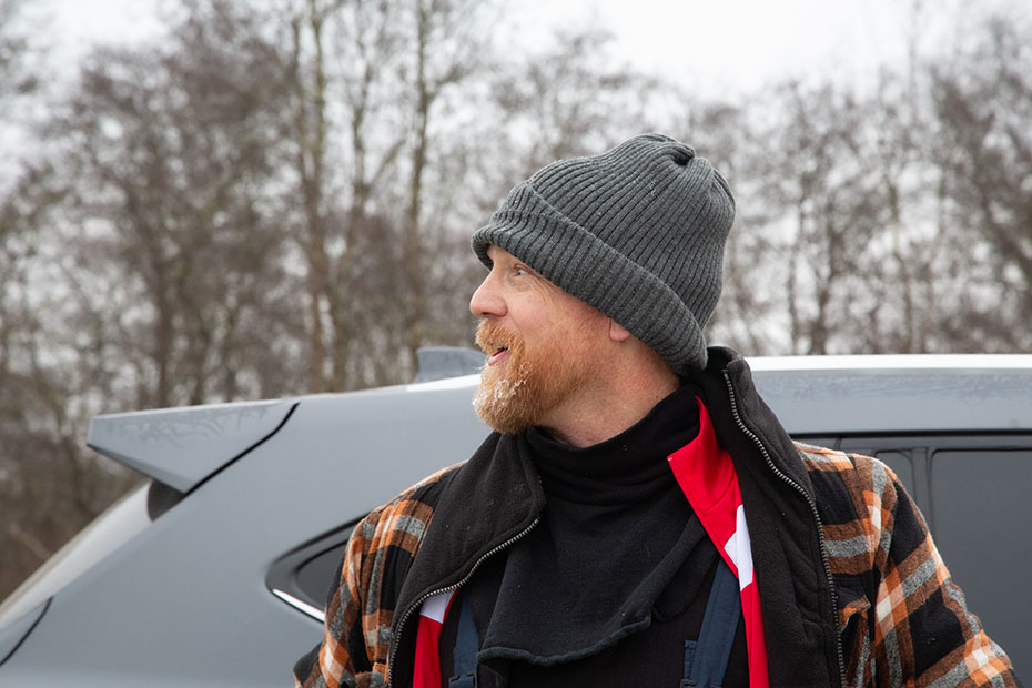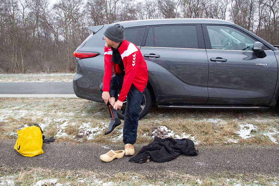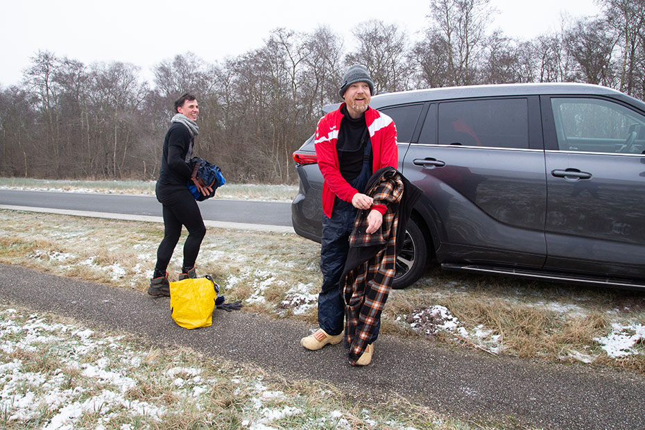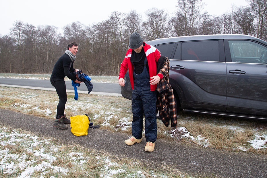 Twee mannen stonden naast hun auto zich uit te kleden. Ze waren door het ijs gezakt. Ze waren er tot hun borst ingegaan. Het was gelukkig goed afgelopen en ze konden de lol er wel van inzien. Het was wel meteen het einde van hun schaatspret.