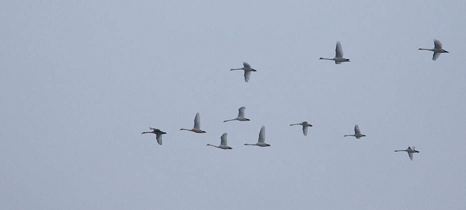 Een groep zwanen vlogen meerdere keren over naarstig op zoek naar open water. Normaal gesproken zijn deze trekgaten hun territorium.