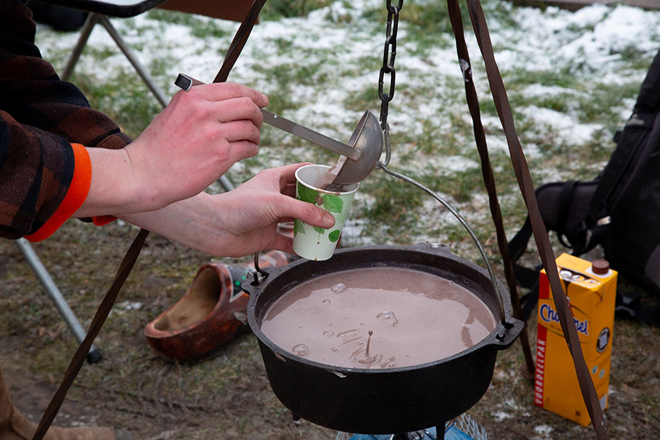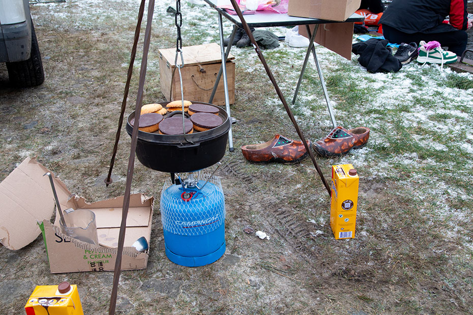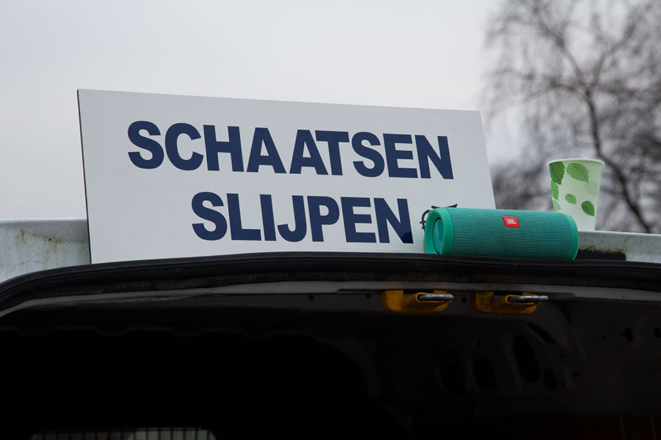 De gezelligheid werd vergroot door een paar ondernemende mannen die koek en zopie aan de man brachten en waar je ook nog de schaatsen kon laten slijpen.