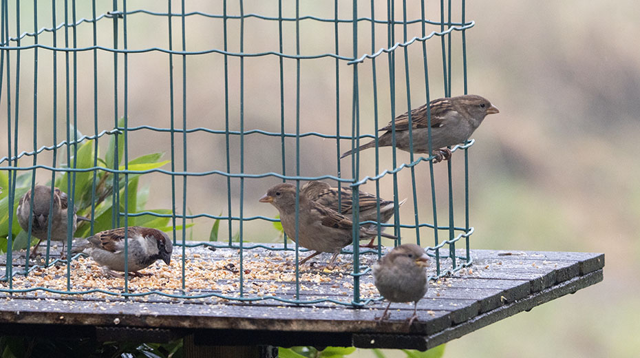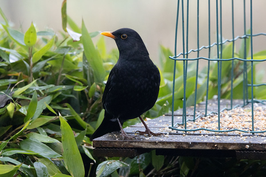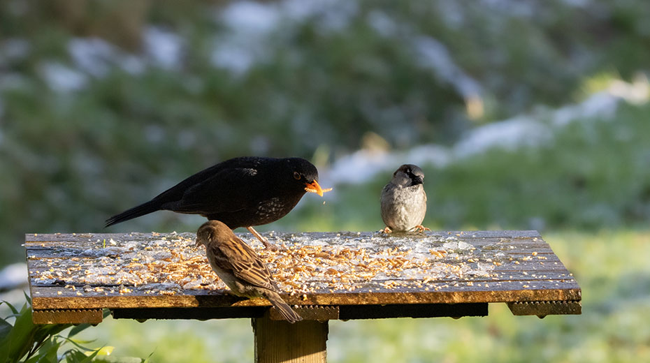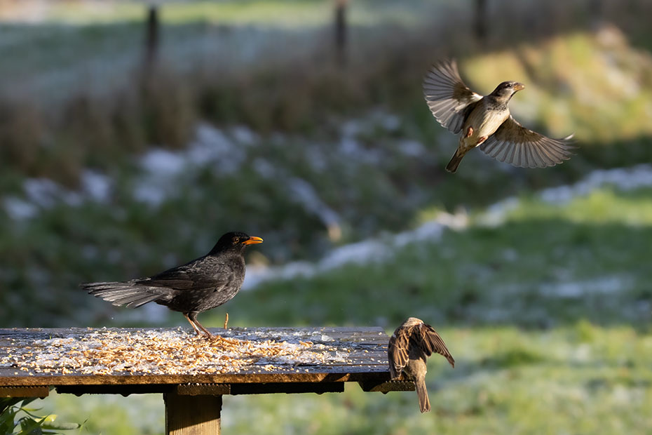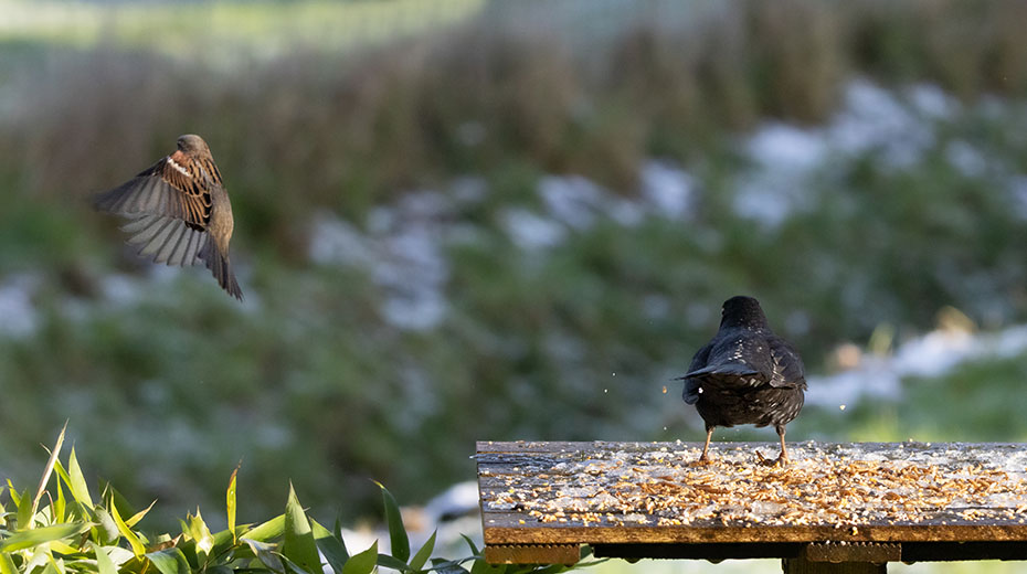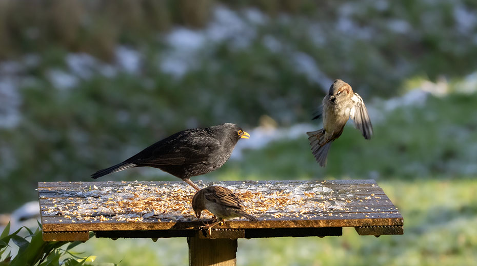 Een merel plofte neer op de voedertafel. De mussen stoven alle kanten op.