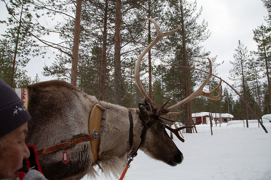 In een lange stoet gleden we door het bos. De gids voorop met achter haar de leider van de groep. Ieder rendier was vastgebonden aan de slee voor hem. Zoon en dochter zaten in de slee voor mij. Ik zat samen met een allervriendelijkste vrouw uit een (wellicht) Aziatisch land in de slee. Helaas was ze de Engelse taal niet machtig en moesten we het doen met glimlachen en gebaren. Het rendier probeerde ons in te halen wat leidde tot spannende taferelen vanwege het enorme gewei. De rendier is overigens de enige hertensoort waarbij zowel de mannetjes als de vrouwtjes geweien dragen.