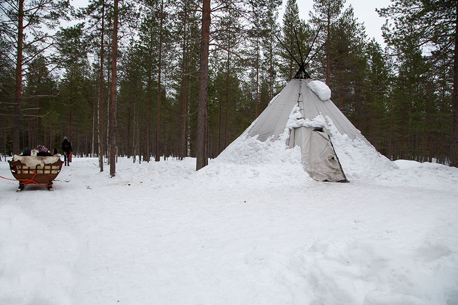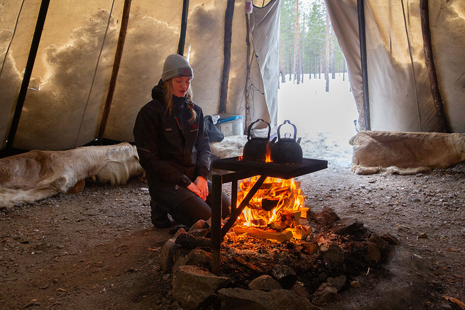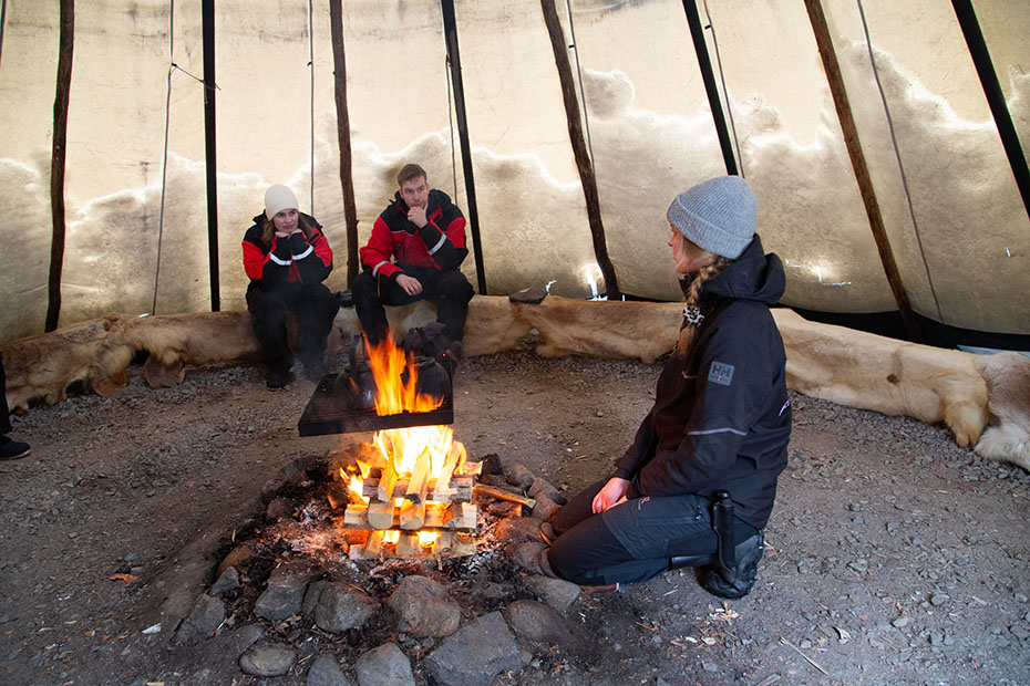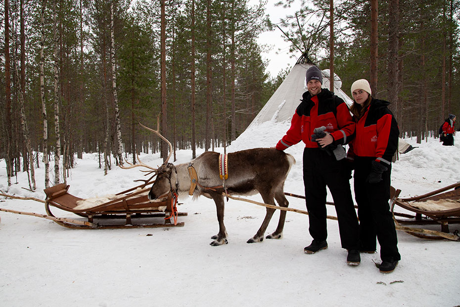 Halverwege de tocht stopten we bij een een Sami-tent. Wij kregen een rendier aangewezen die we op de rug mochten aaien. Terwijl wij druk waren met het aaien en de fotosessie maakte onze gids in de tent een vuurtje en warmde het drinken op. We konden kiezen uit hete thee, koffie of hot berry juice. Blackberry juice, warm of koud wordt daar veel gedronken. Onder het genot van het warme drankje vertelde ze ons alles over de rendieren en beantwoorde ze onze vragen. Doordat onze kinderen vloeiend Engels spreken was er de meeste interactie tussen hen en de gids.