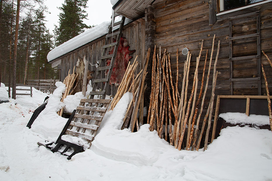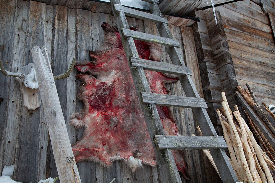 Terwijl de anderen nog aan het voeren waren ging ik bij de voorraadschuur enkele foto’s maken. Er hing een vers rendiervacht aan de schuur te drogen. In heel Lapland kunnen maximaal 200.000 rendieren leven. Wanneer er meer dieren zijn, sterven ze van de honger. Ieder jaar worden 120.000 rendieren geboren, een aantal worden door wolven, beren, lynxen en vossen opgegeten en het overschot wordt geslacht. Elke boer dient een evenredig deel aan te leveren voor de slacht.
